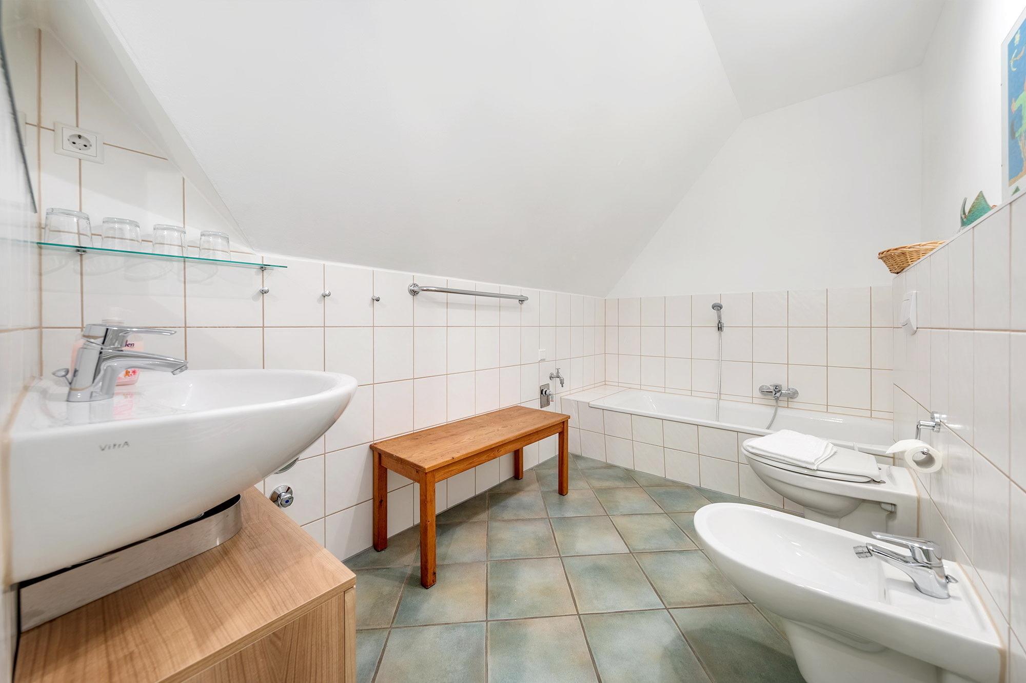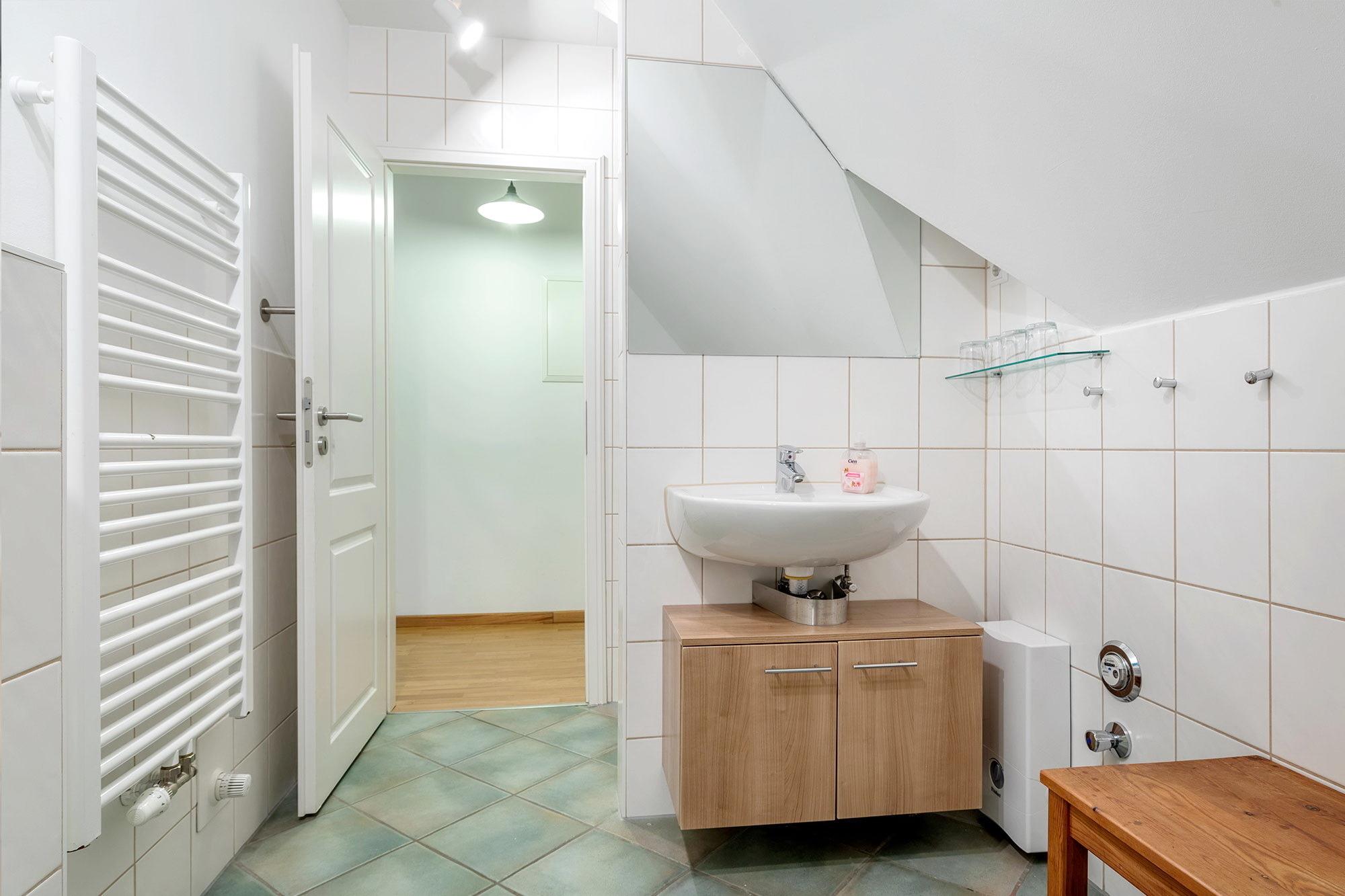 Ganz viel Platz für Sie und Ihre Familie bietet „die große Grüne“ Ferienwohnung. Sie umfasst rund 70 Quadratmeter Wohnfläche und besticht durch ihre funktionale Raumaufteilung und die harmonische Farbgebung. Das geräumige Wohn- und Esszimmer mit seinem schönen Gaubenfenster ist neben einer komfortablen Sitzgarnitur, Flachbild-TV und Radio/CD-Player auch mit einem Kaminofen ausgestattet, der nicht nur an kalten Winterabenden für wohlige Wärme sorgt. Alles wirkt hell, freundlich und mit viel Liebe zum Detail eingerichtet.