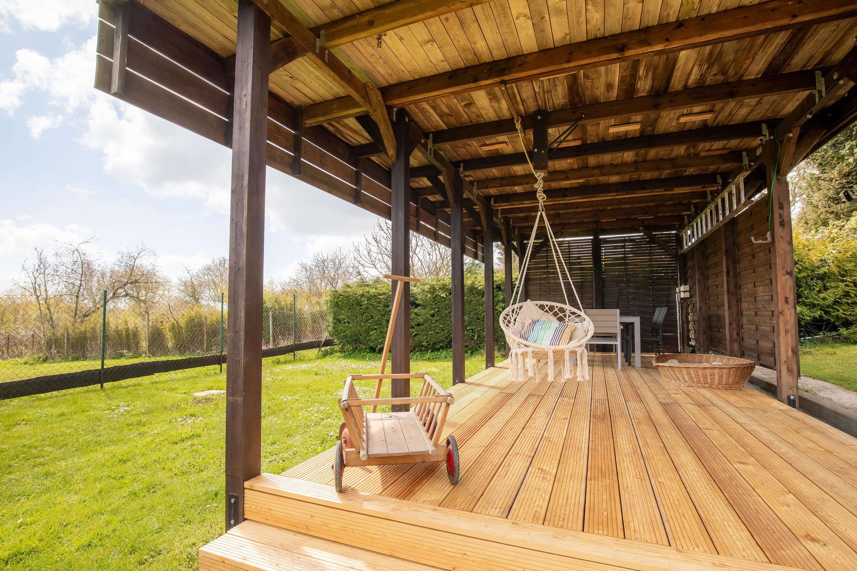 Ein weiteres Plus ist das ca 1000qm große und gepflegte Grundstück. Neben einer privaten Sauna (separat buchbar) und einer Terrasse mit Strandkorb, punktet das Grundstück mit einer weiteren, überdachten Terrasse. So können Sie entweder Schatten im Hochsommer, oder Schutz bei Witterung suchen und sind trotzdem inmitten der Natur.
