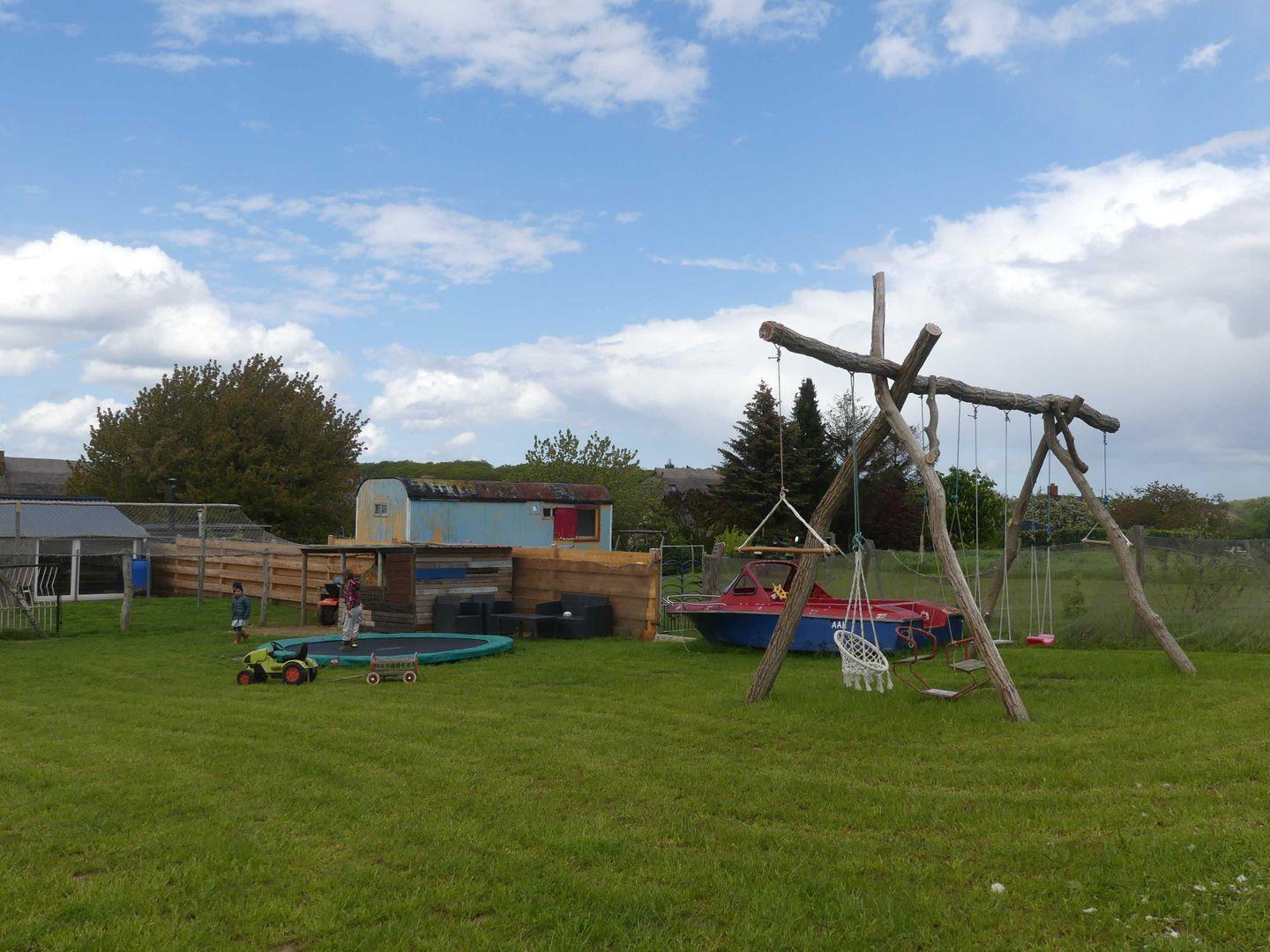 * für die Kinder: große Schaukel, gr. Trampolin, Spielgeräte, Fußballwiese mit Tor