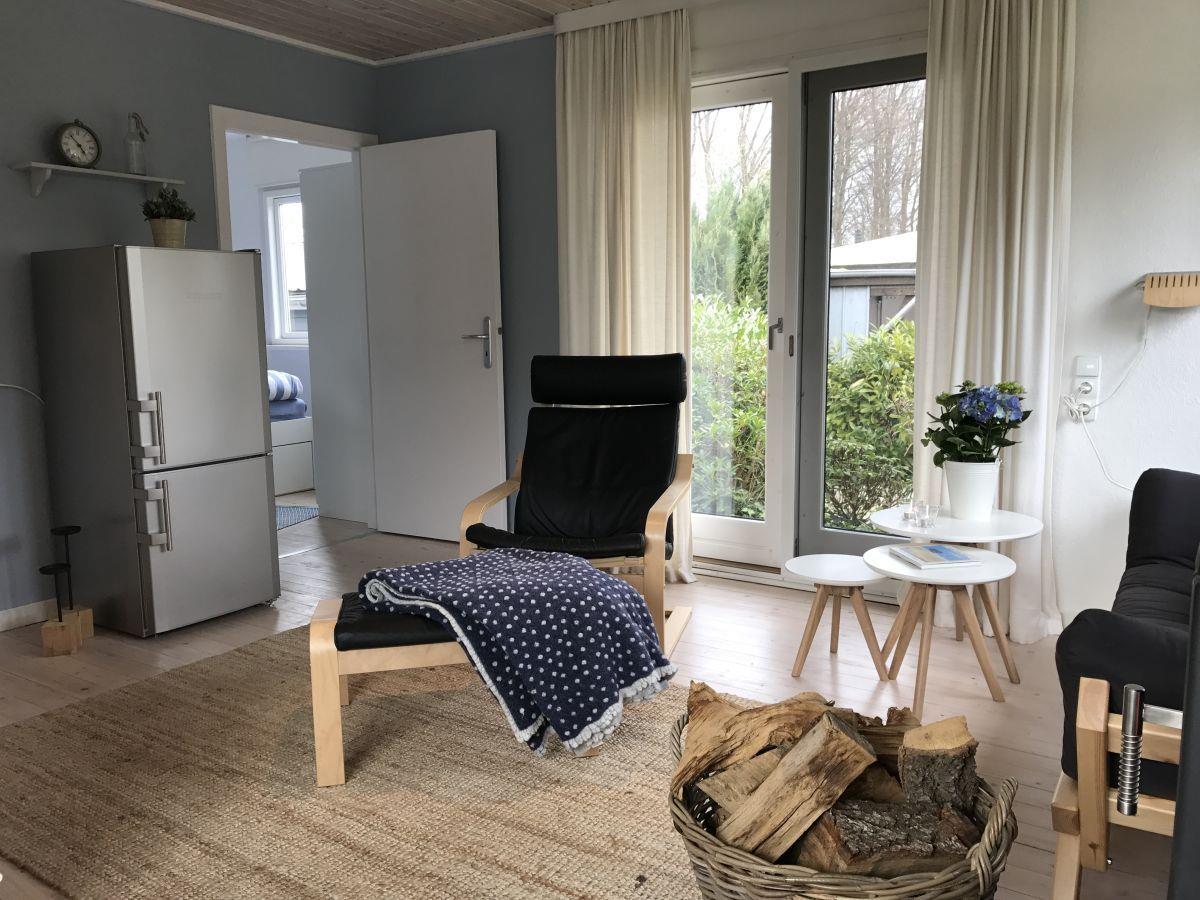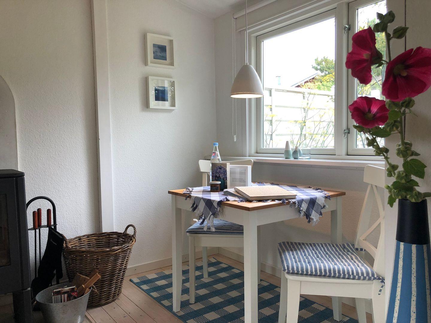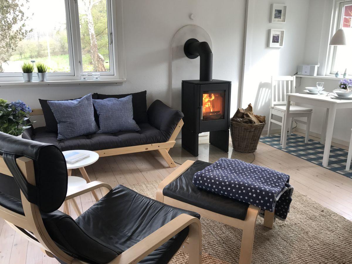 Der einladende Wohnbereich ist hell und optimal eingerichtet mit einer Couch, Schwingsessel und Kamin, kann man hier entspannte Stunden verbringen. Der Holzofen sorgt für wohlige Wärme und ein Stück Hygge – das Feuerholz liegt direkt am Haus bereit. Der Essbereich bietet Platz für 2 Personen und ist am hellen Fenster mit Blick in den ungestörten Garten perfekt ausgerichtet.