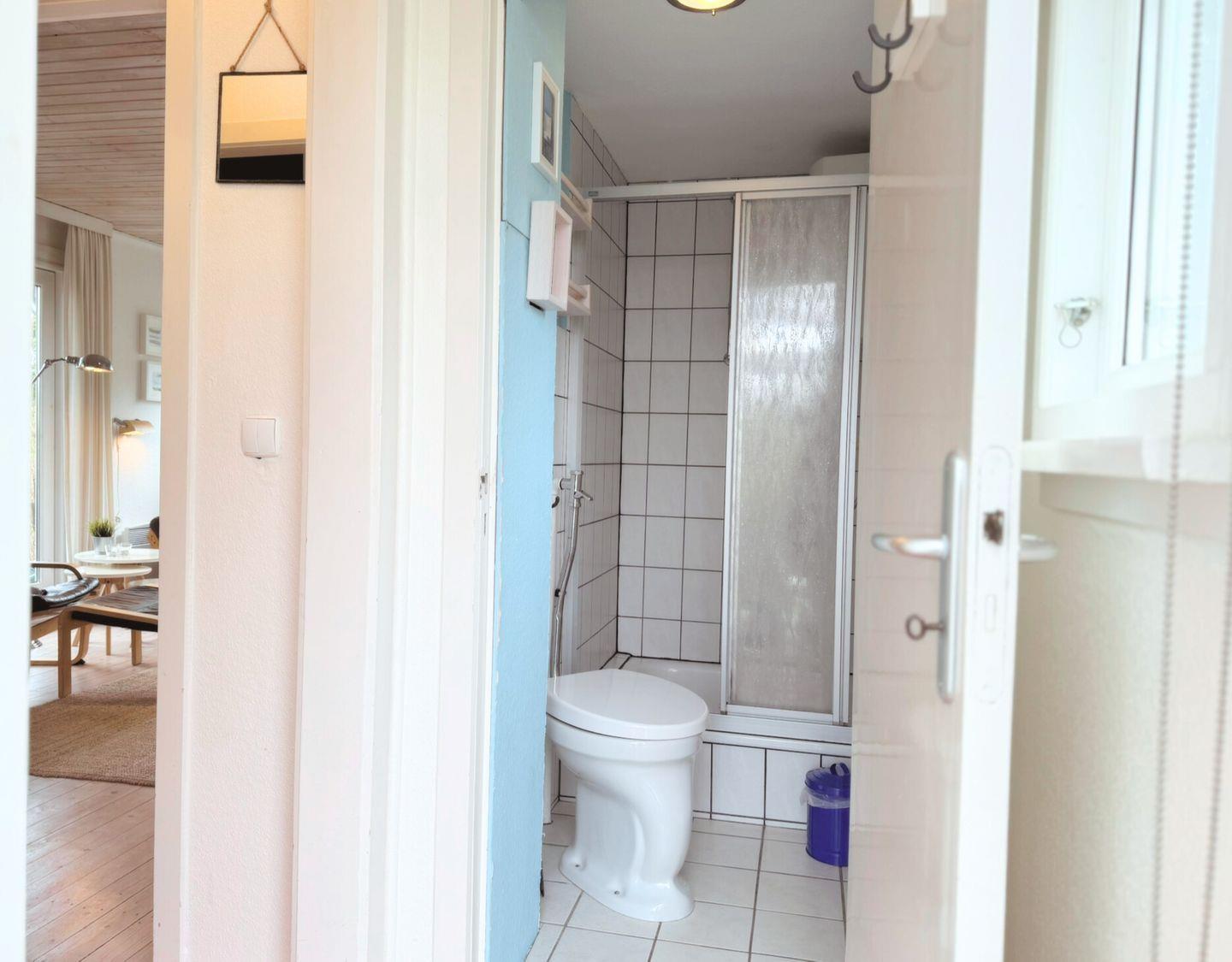 Das kleine Badezimmer ist funktional mit Dusche und WC eingerichtet, das Waschbecken befindet sich in der angrenzenden Küche.