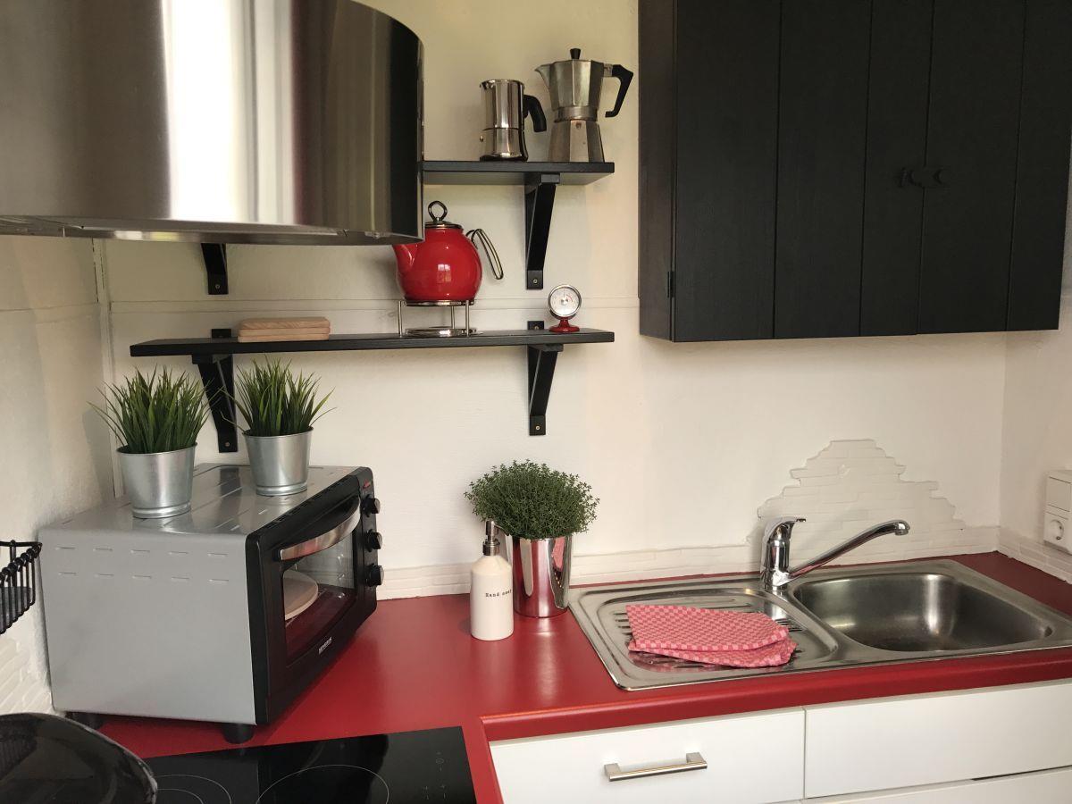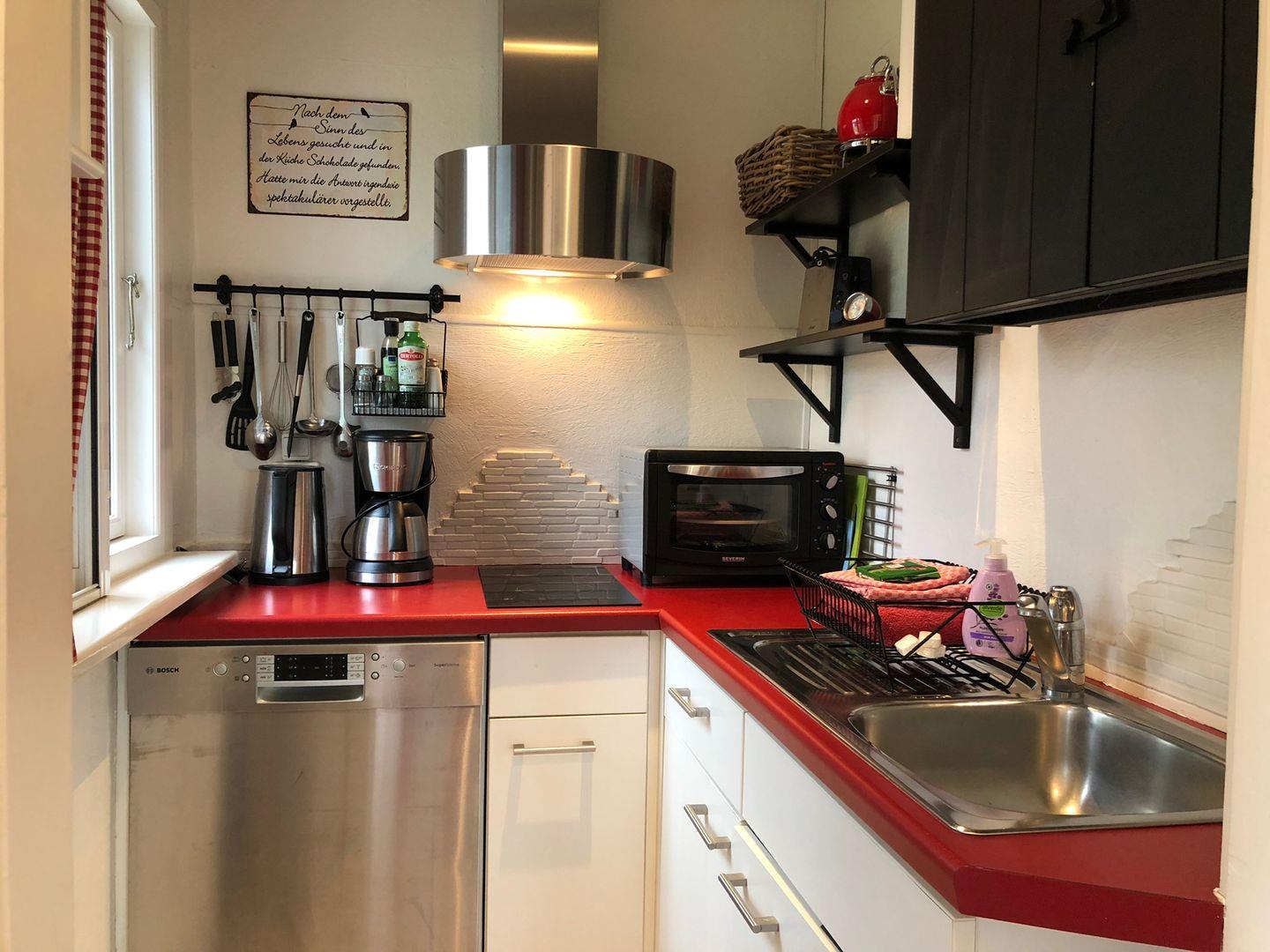 Die offene Kochnische ist mit 2er Ceranherd, kleinem Backofen und Spülmaschine gut ausgestattet. Auch Toaster, Wasserkocher, Kaffeemaschine sowie eine kleine Erstausstattung an Gewürzen und Reinigungsmitteln sind vorhanden.