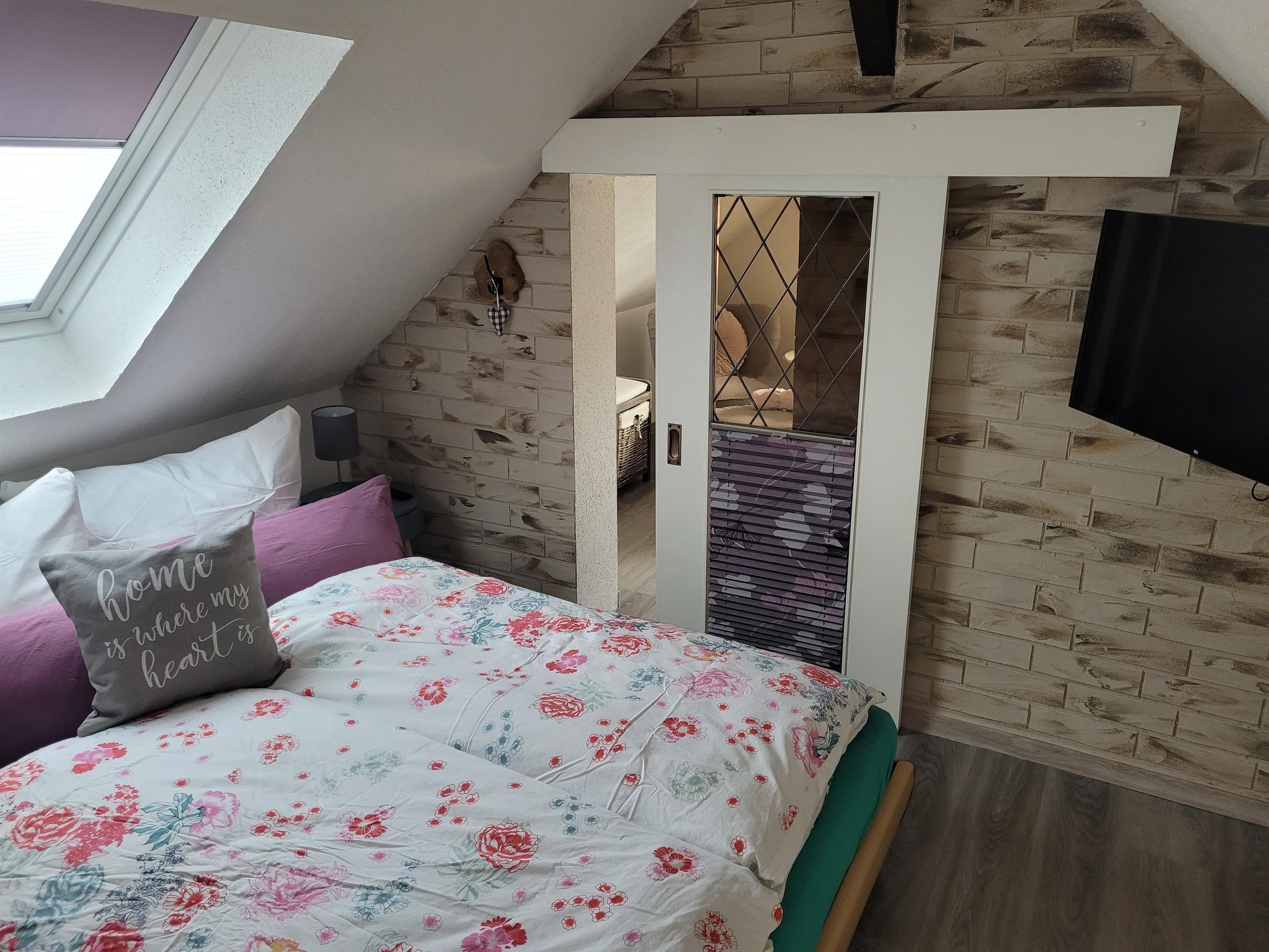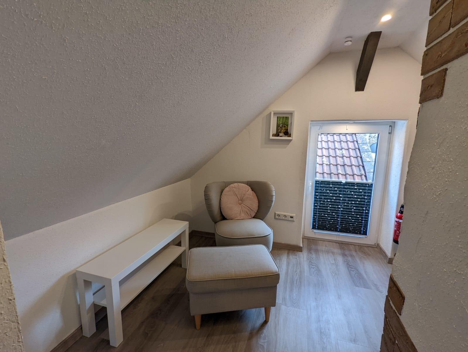 Ins Dachgeschoss gelangt man durch eine schmale Raumspartreppe(nicht für Kleinkinder und in der Mobiltät beeinträchtigte Personen geeignet).