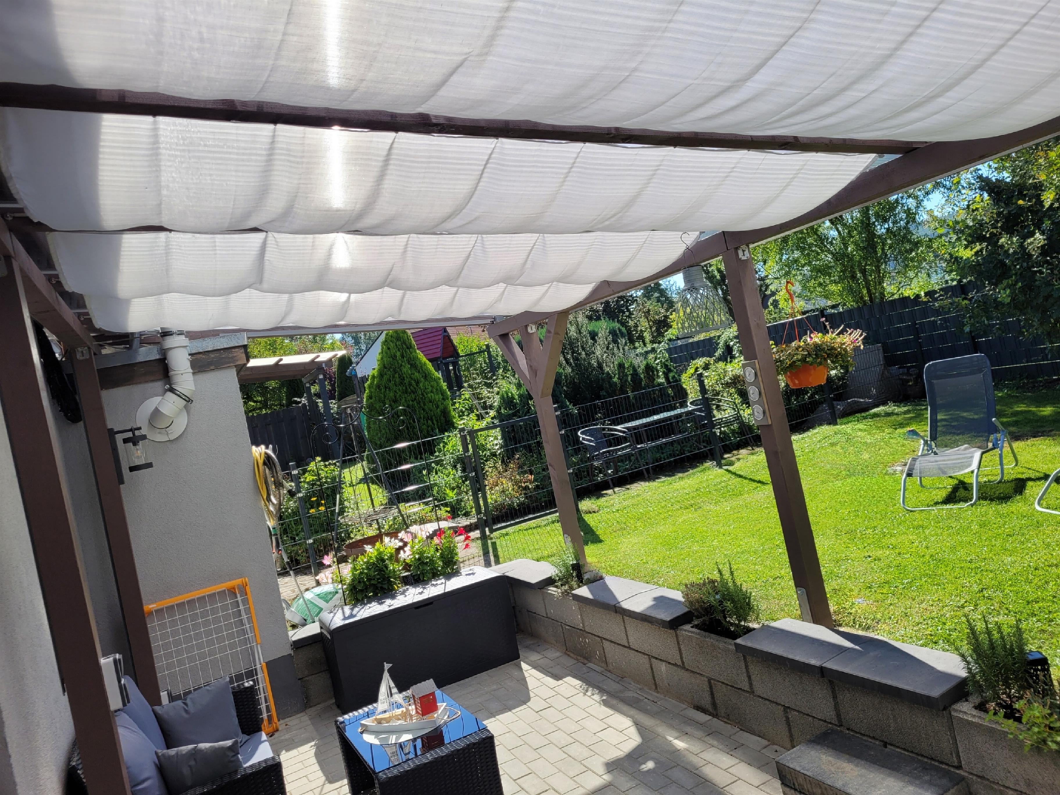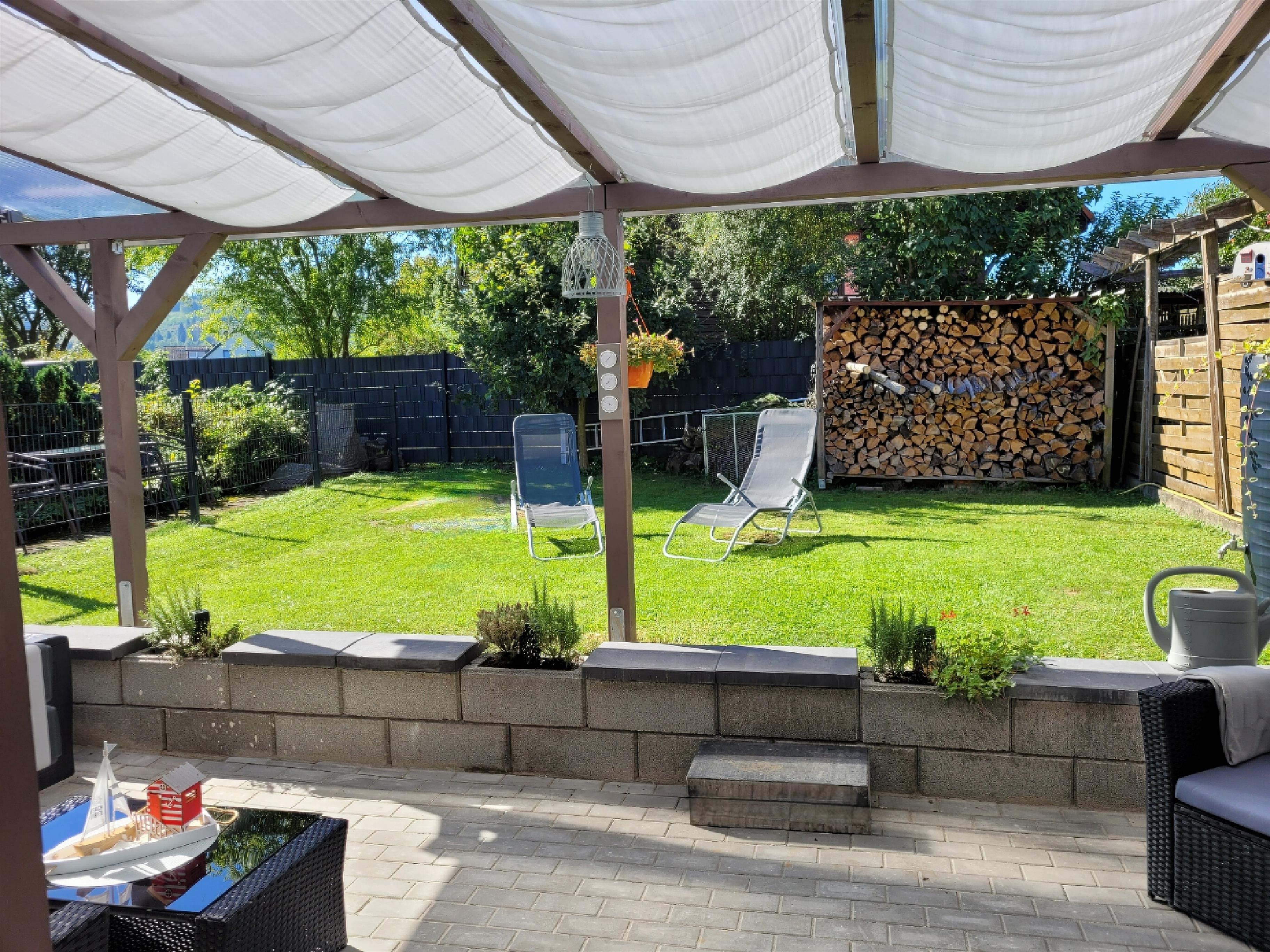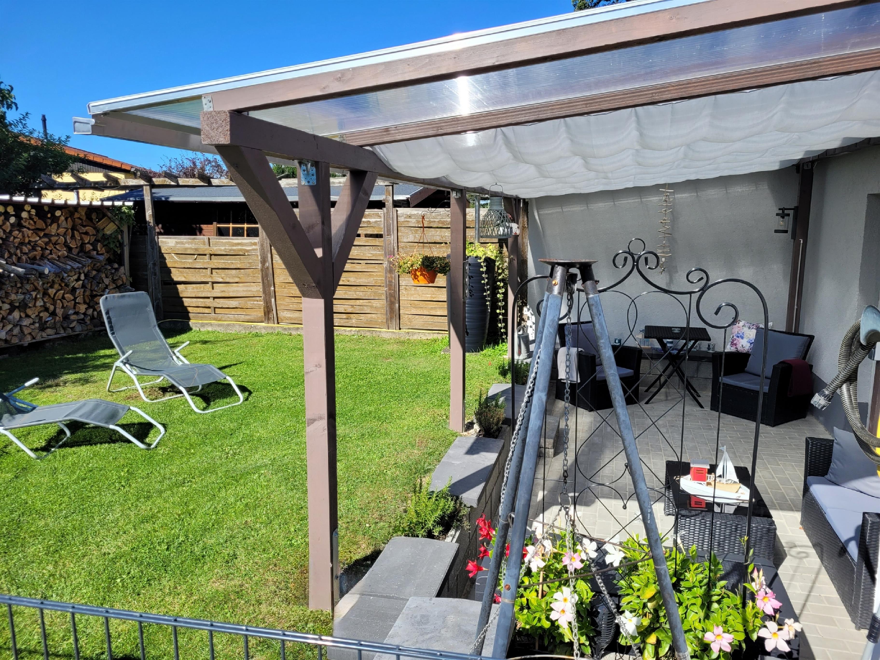 vom Wohnzimmer der kleinen Remise gelangt man auf die 15qm überdachte Terrasse mit Sonnensegeln und in den Garten.