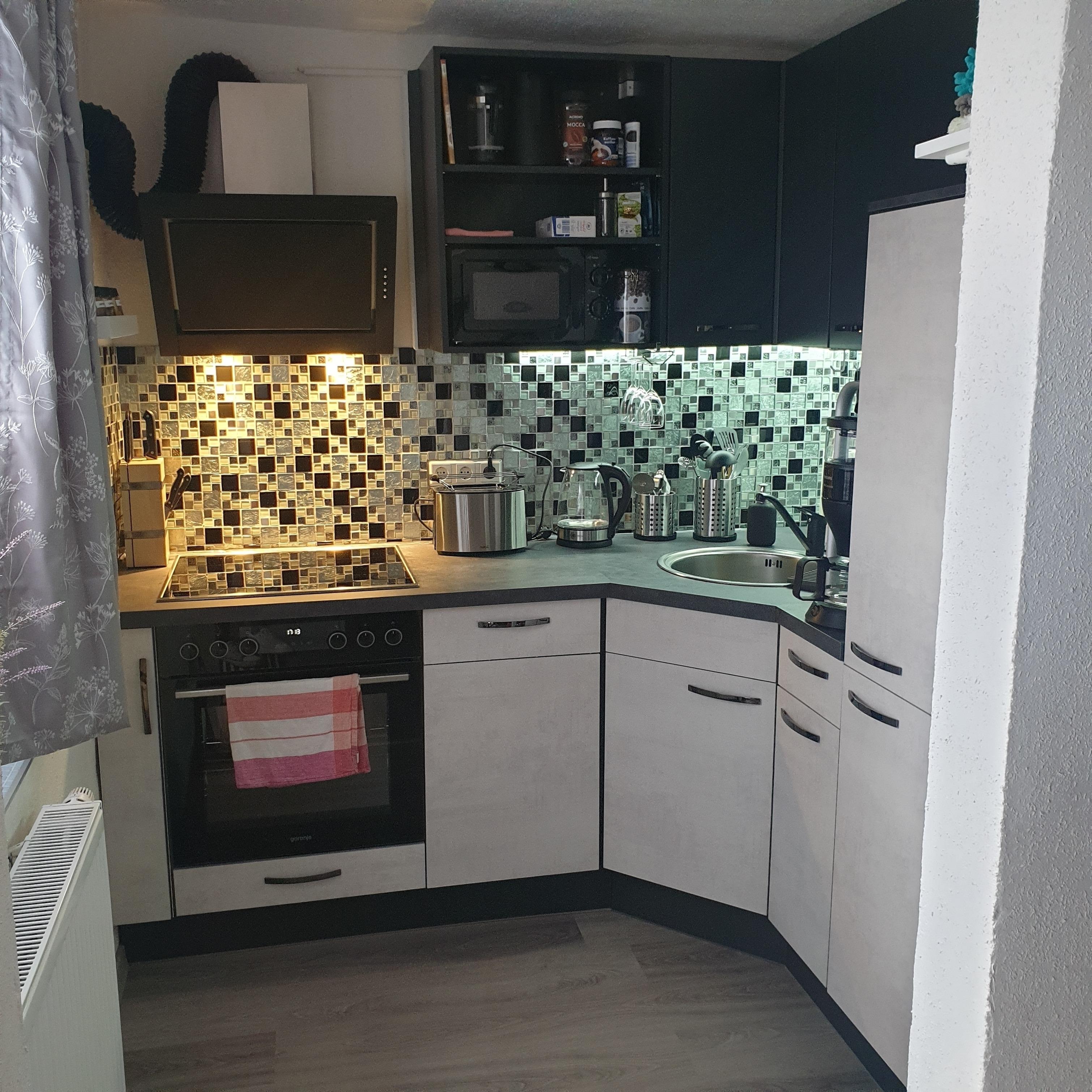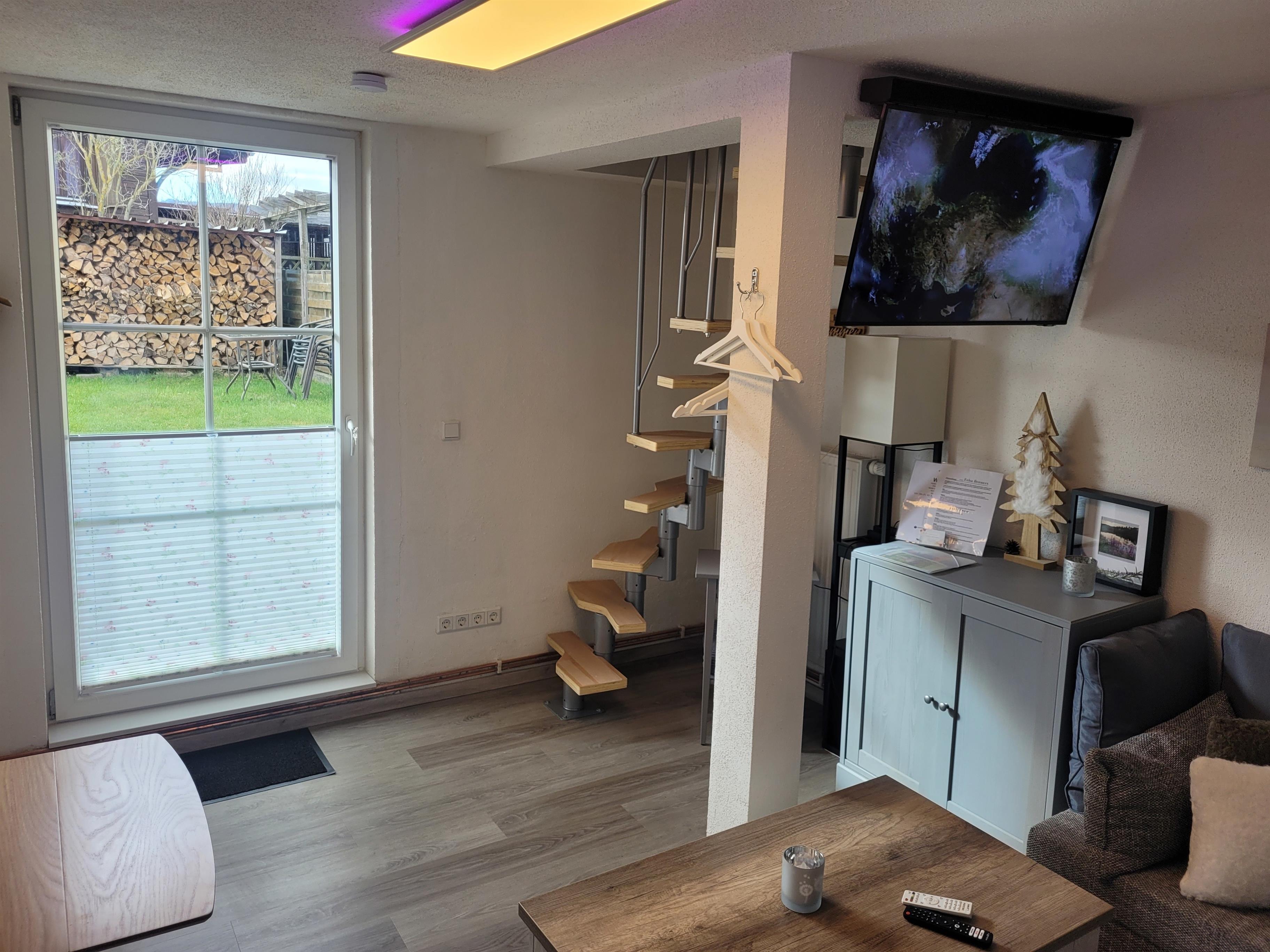 Im Erdgeschoß befindet sich die vollausgestattete Einbauküche mit Induktionsherd, Spülmaschine, Mikrowelle etc., ein Tageslicht-Bad mit Dusche, WC und Waschmaschine und das Wohnzimmer mit Schlafcouch, Ethanolkamin, TV mit Soundanlage und Radio.