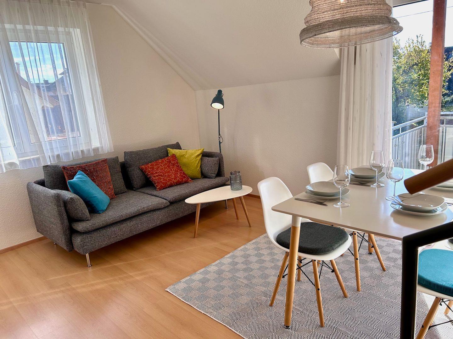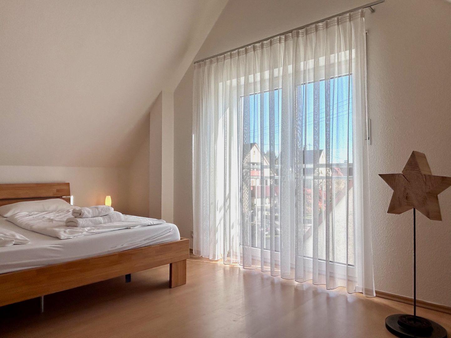 Die Ferienwohnung „Strandgut" befindet sich in see- und zentrumsnaher Lage in Langenargen am Bodensee und ist ein wunderbarer Ausgangspunkt für Ihren Strandspaziergang. Die moderne, knapp 70 qm große Maisonette-Wohnung hat einen Süd-Balkon mit teils bodentiefen Fenstern und ist ausgestattet für 4 Personen. In der modern eingerichteten Ferienwohnung mit TV werden Sie sich wohlfühlen. Die Wohnung verfügt über ein Schlafzimmer im 1. OG und einem weiteren Schlafzimmer mit TV Gerät im oberen Maisonette Bereich. Die Schlafzimmer sind jeweils mit Doppelbett und Kleiderschrank ausgestattet. In einem der Zimmer findet auch noch gut ein mitgebrachtes Baby-Reisebett Platz.