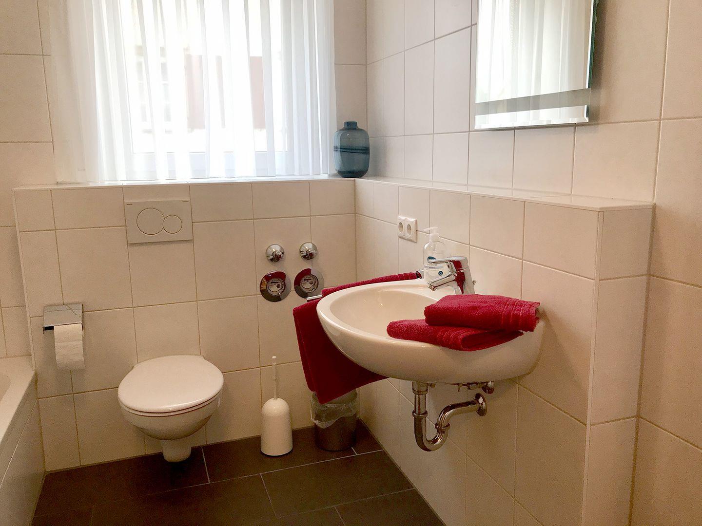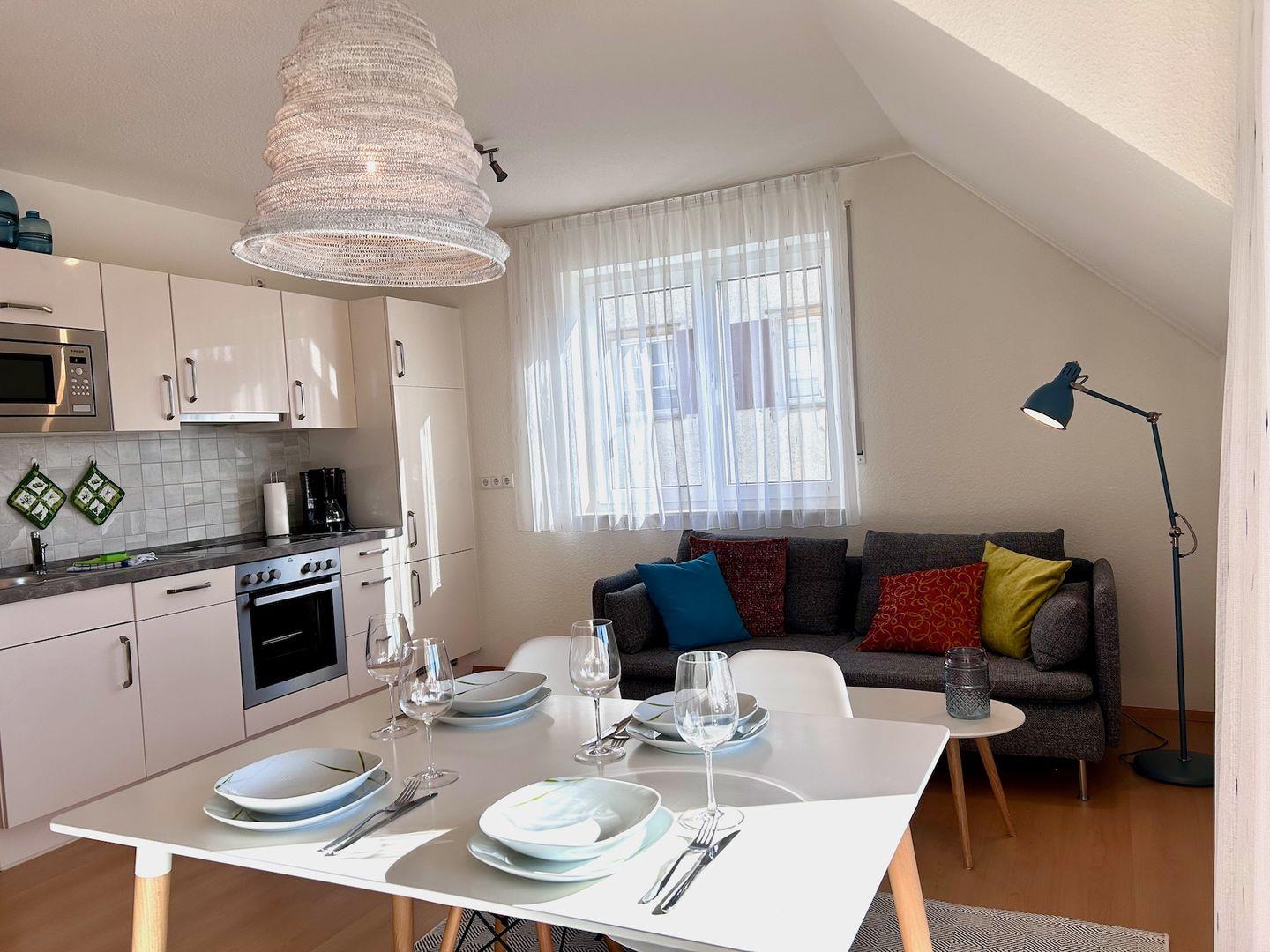 Es gibt einen offenen Wohn- Essbereich mit komplett ausgestatteter Küche mit Herd, Backofen und den notwendigen Kleingeräten wie Kaffeemaschine, Toaster und Wasserkocher. Die Wohnung ist eine Nichtraucherwohnung! Wenn Sie rauchen möchten, gerne auf dem Balkon.