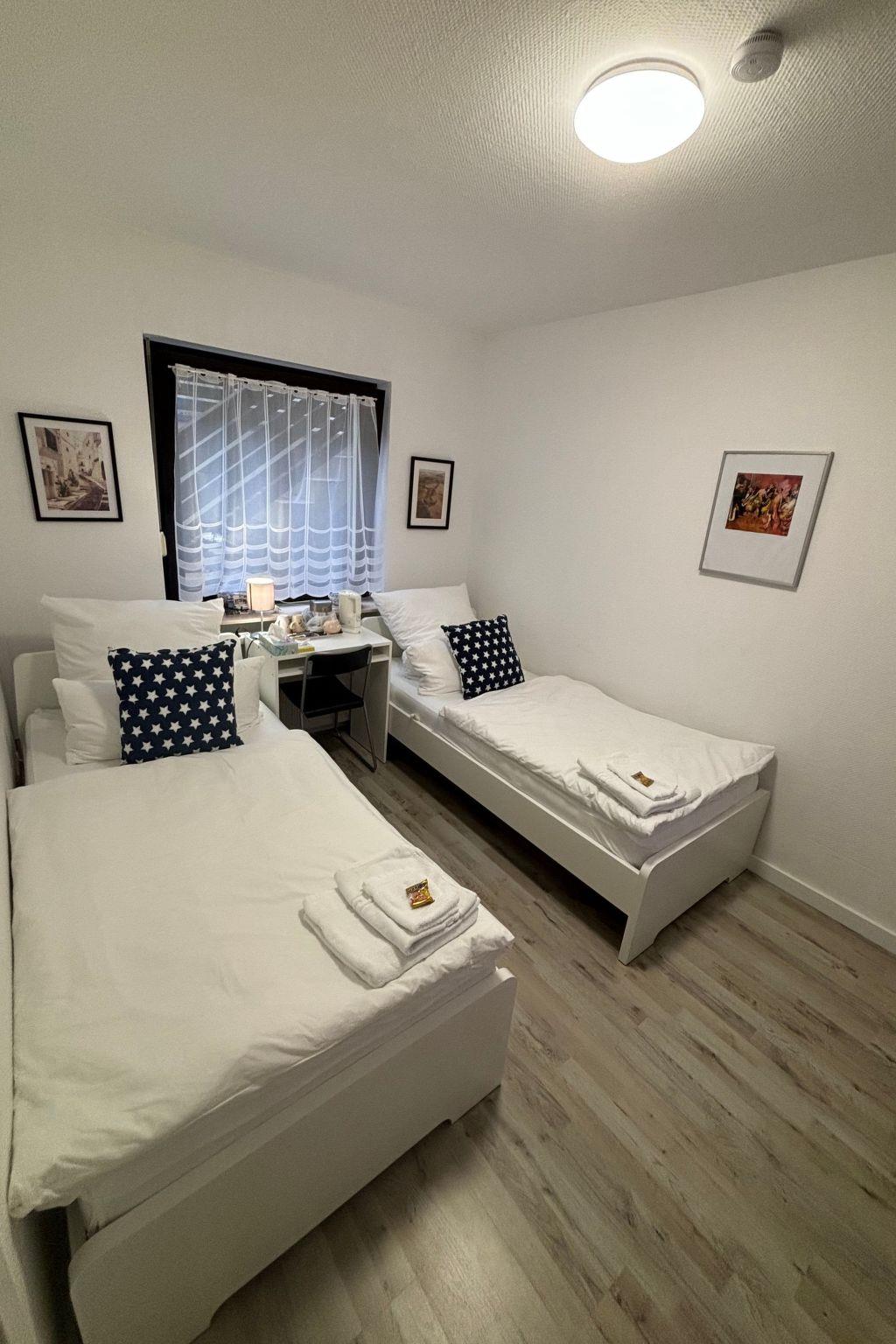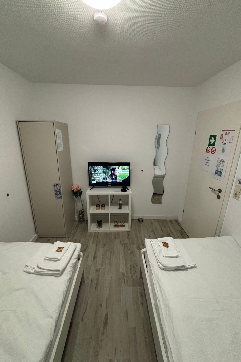 Inside, you will find a cosy environment specially designed to make your stay as pleasant as possible. Pleasant underfloor heating, which is distributed throughout the basement, ensures warm feet and a cosy feeling even in cooler months. For your convenience, air conditioning is available in some rooms to keep you cool and comfortable even on warmer days. Each room is also equipped with a practical work desk, a large mirror, a wardrobe and a TV that provides access to a variety of entertainment options such as German TV, Amazon Prime, Netflix and Disney Channel. The rooms are ideally tailored to the needs of up to two people, and the free Wi-Fi connection rounds off the offer for a carefree stay.