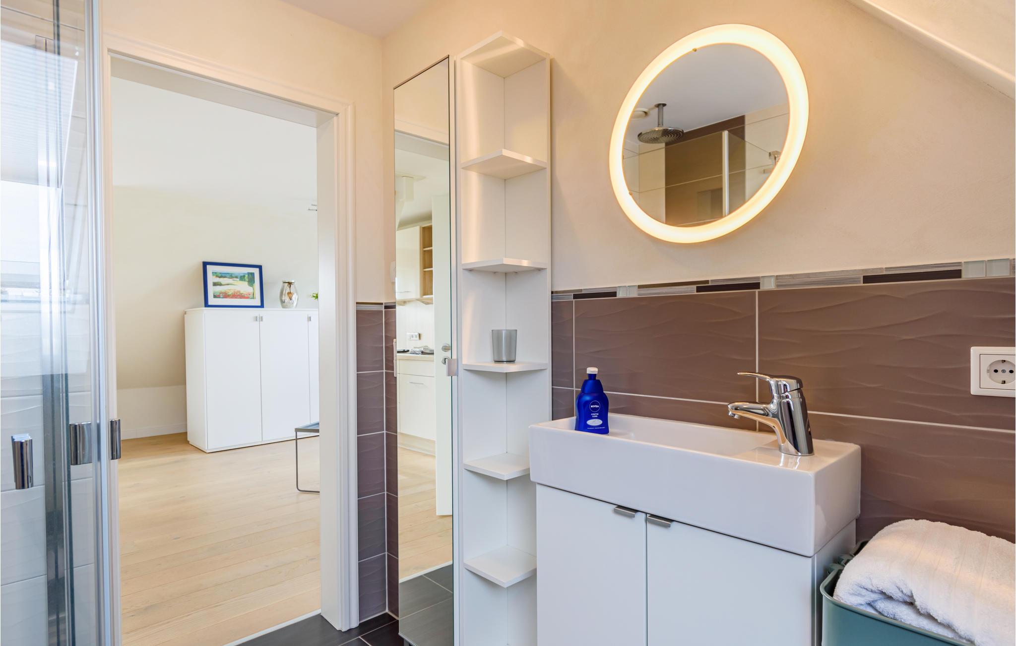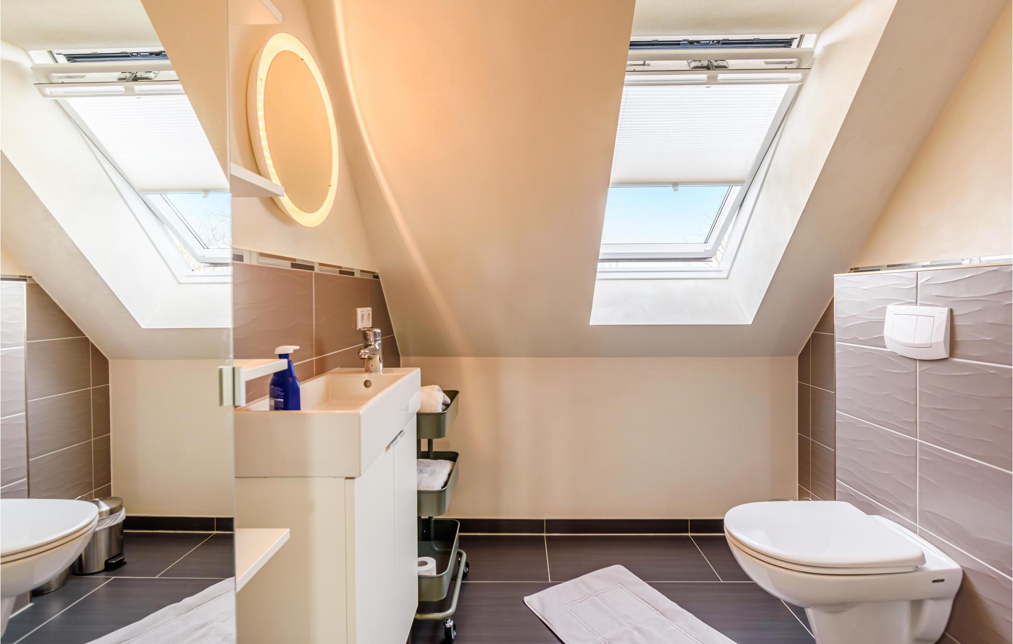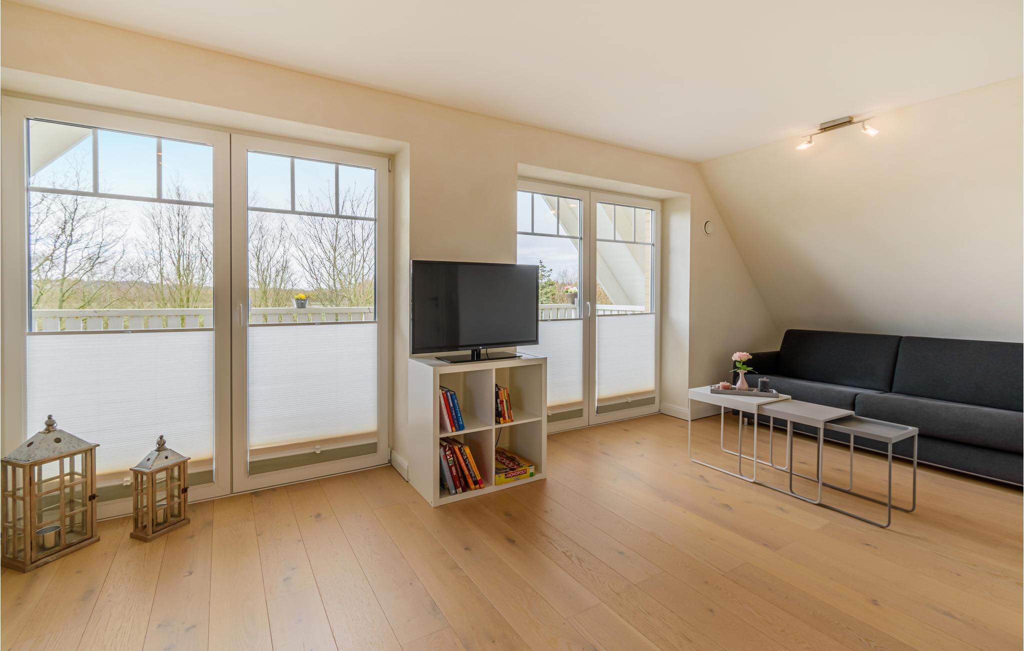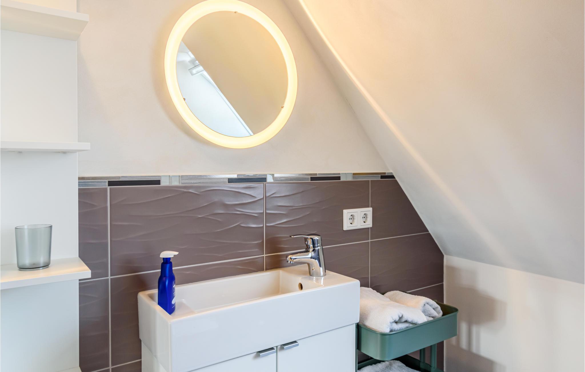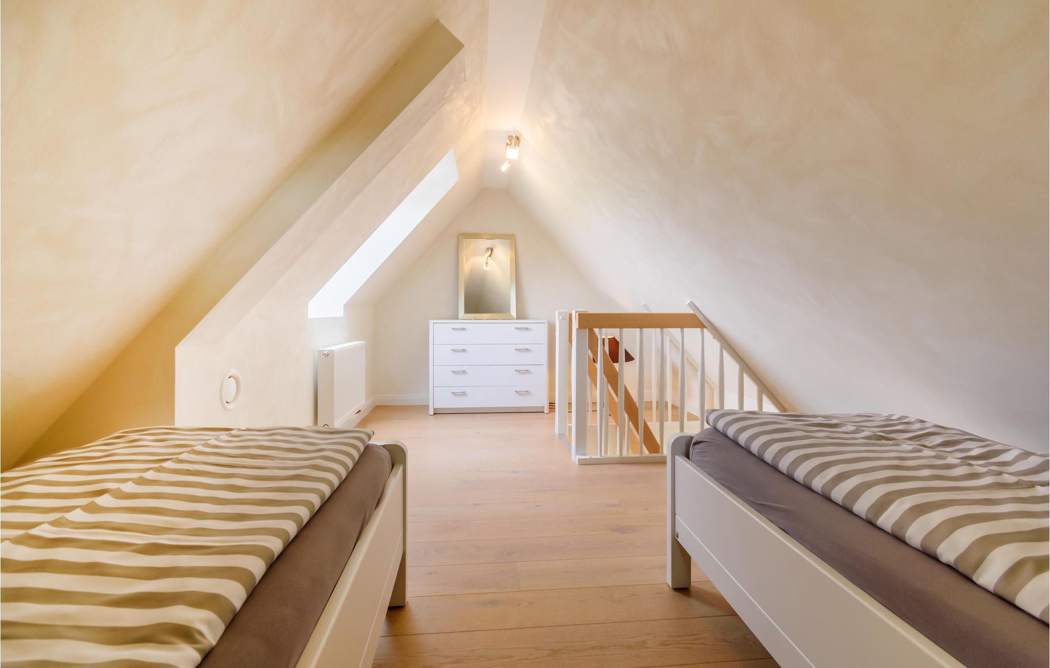 Den er velindrettet med alt, hvad I vil få brug for til en skøn og afslappende ferie ved Schleswig-Holsteins vestkyst. Den åbne lejlighed er veludstyret, og I finder alt i det lækre badeværelse. Det øverste soveværelse kommer I til via den lidt stejle trappe med gelænder i begge sider.