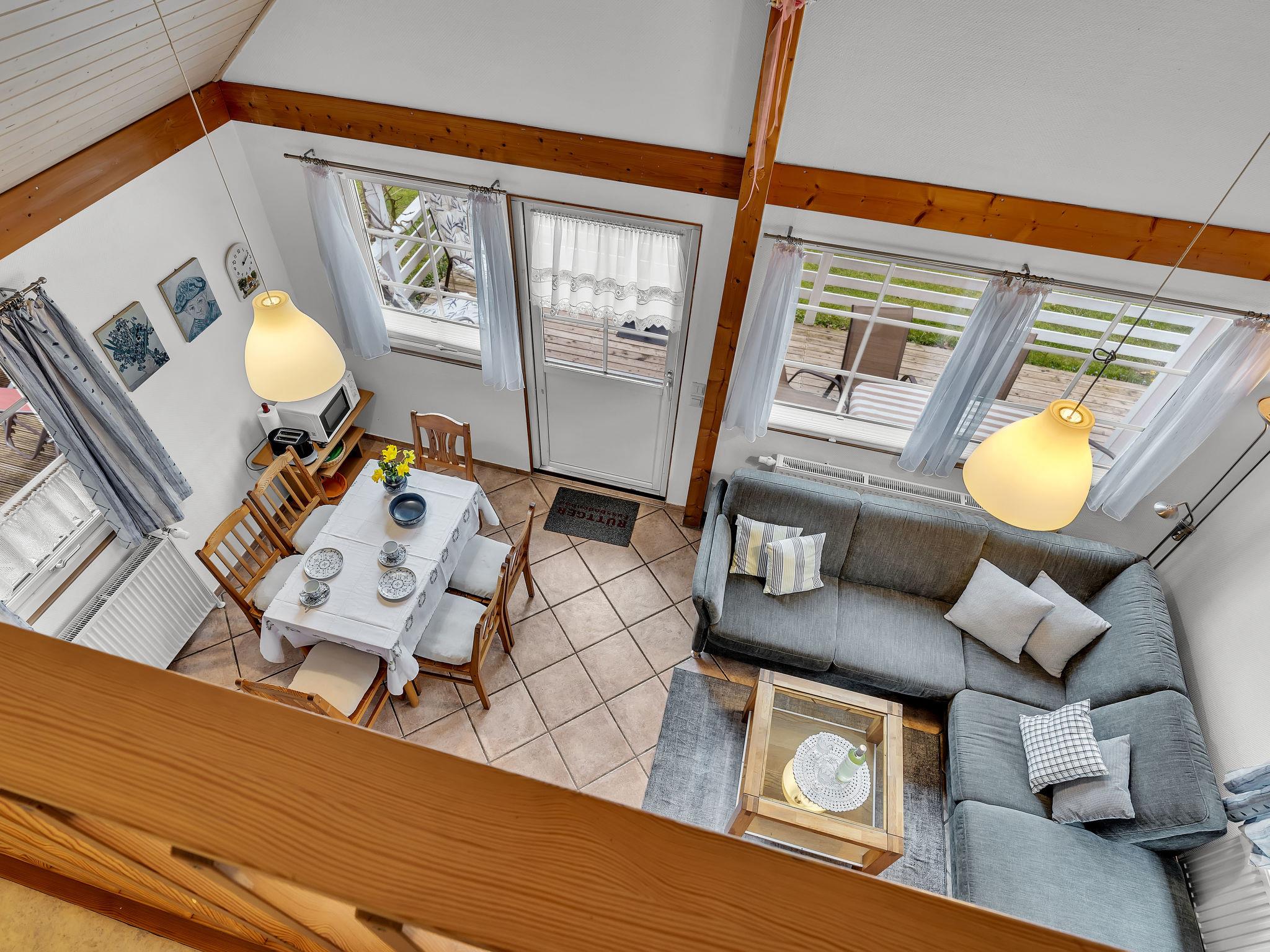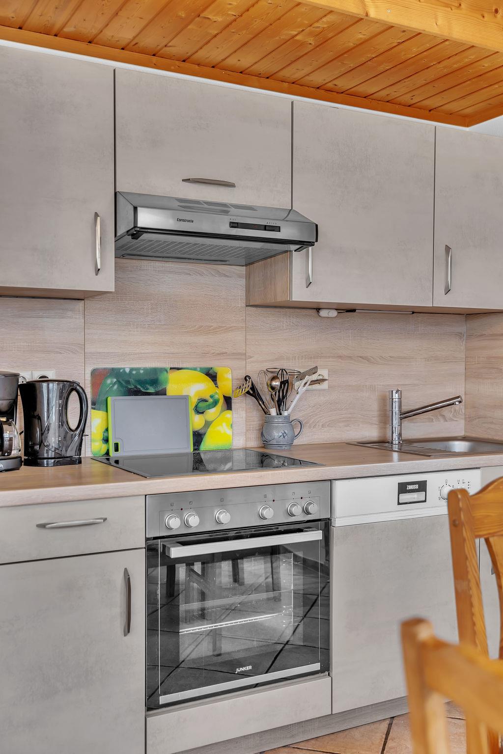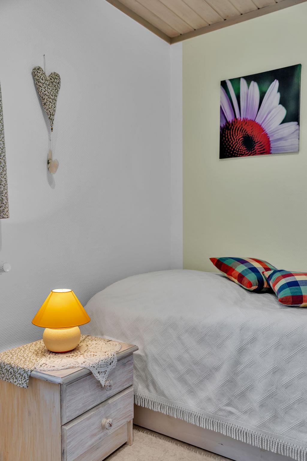 4-room house 80 m2 on 2 levels. Object suitable for 6 adults. Bright, cosy furnishings: living/sleeping room with 1 double sofabed (150 cm, length 200 cm), dining table, satellite TV and radio. Exit to the terrace. 1 room with 1 double bed. 1 room with 1 bed and 1 pull-out bed. Open kitchen (oven, dishwasher, 4 ceramic glass hob hotplates, toaster, kettle, microwave, electric coffee machine). Shower/WC. Electric heating. Upper floor: 1 room with sloping ceilings with 2 beds. Terrace furniture. Facilities: sauna, children's high chair, baby cot for up to 2 year olds. Internet (WiFi, extra). Please note: non-smoking house. Smoke alarm.