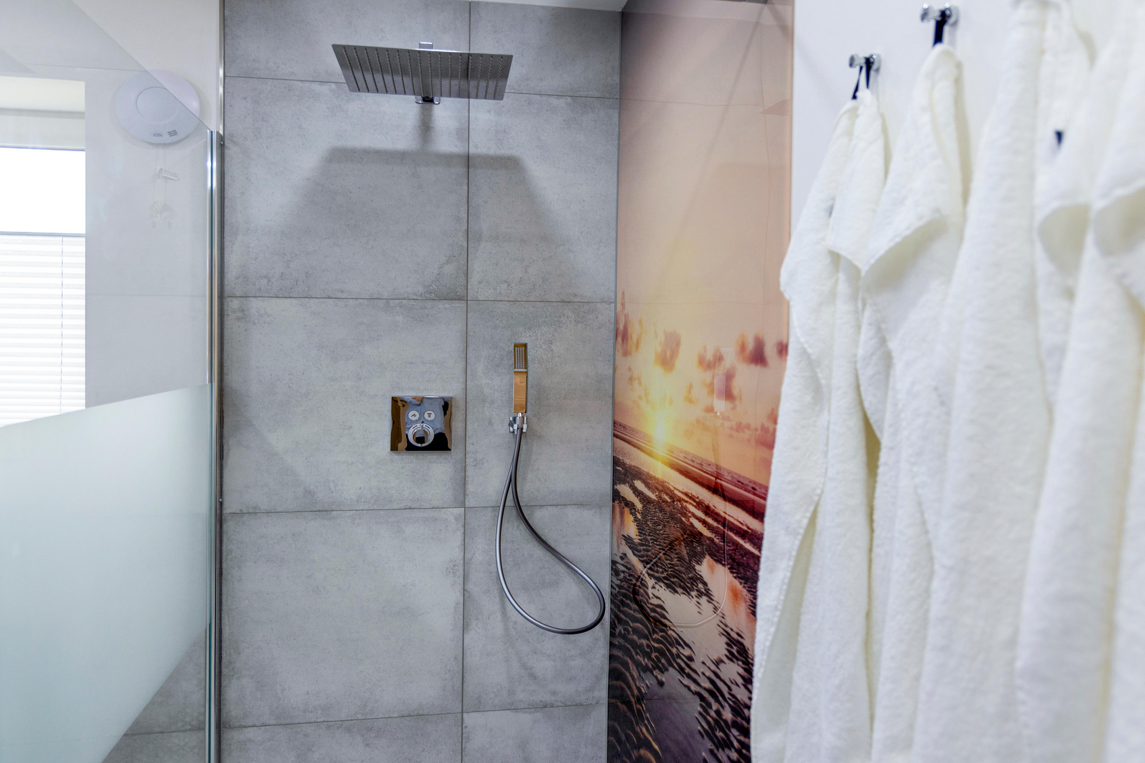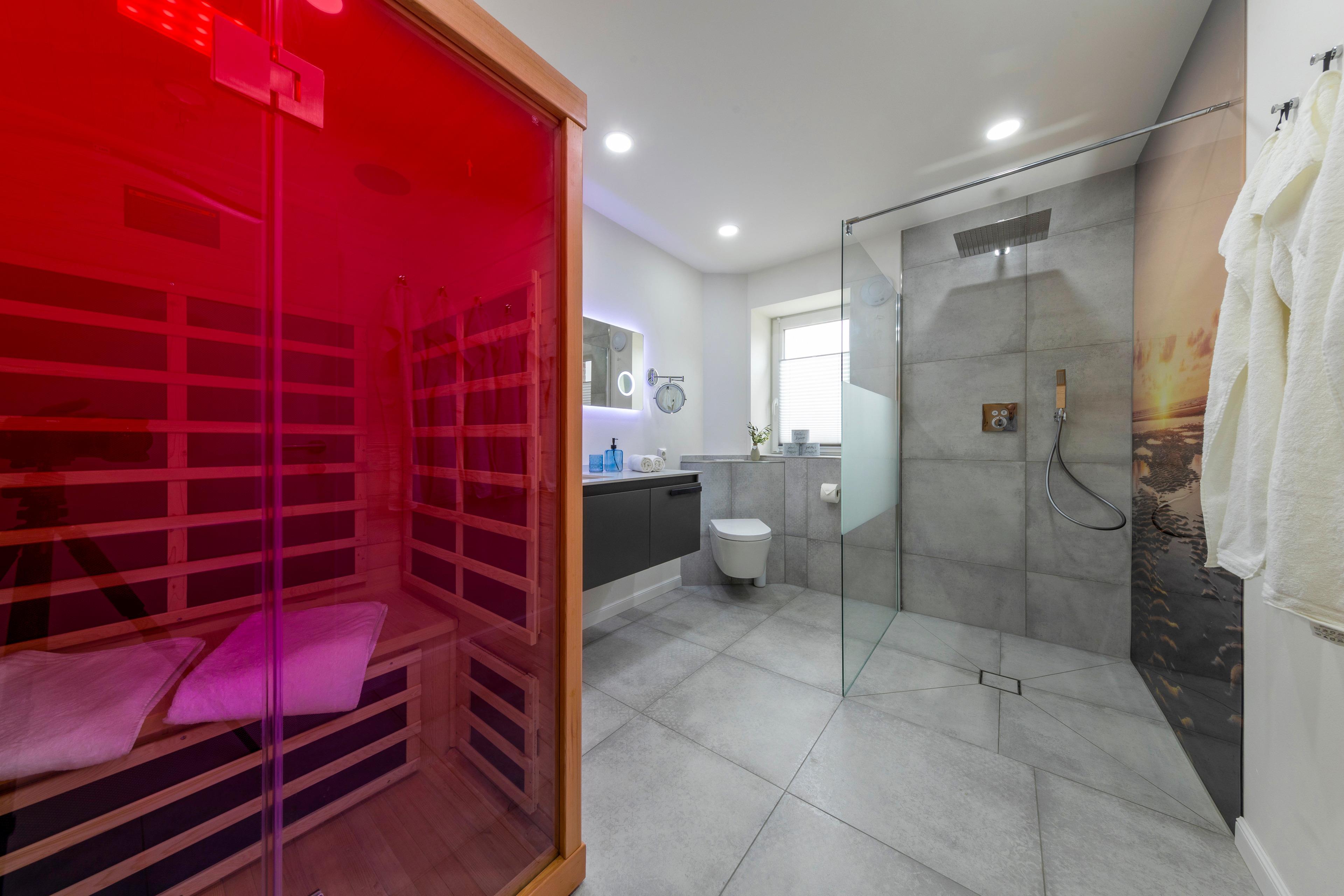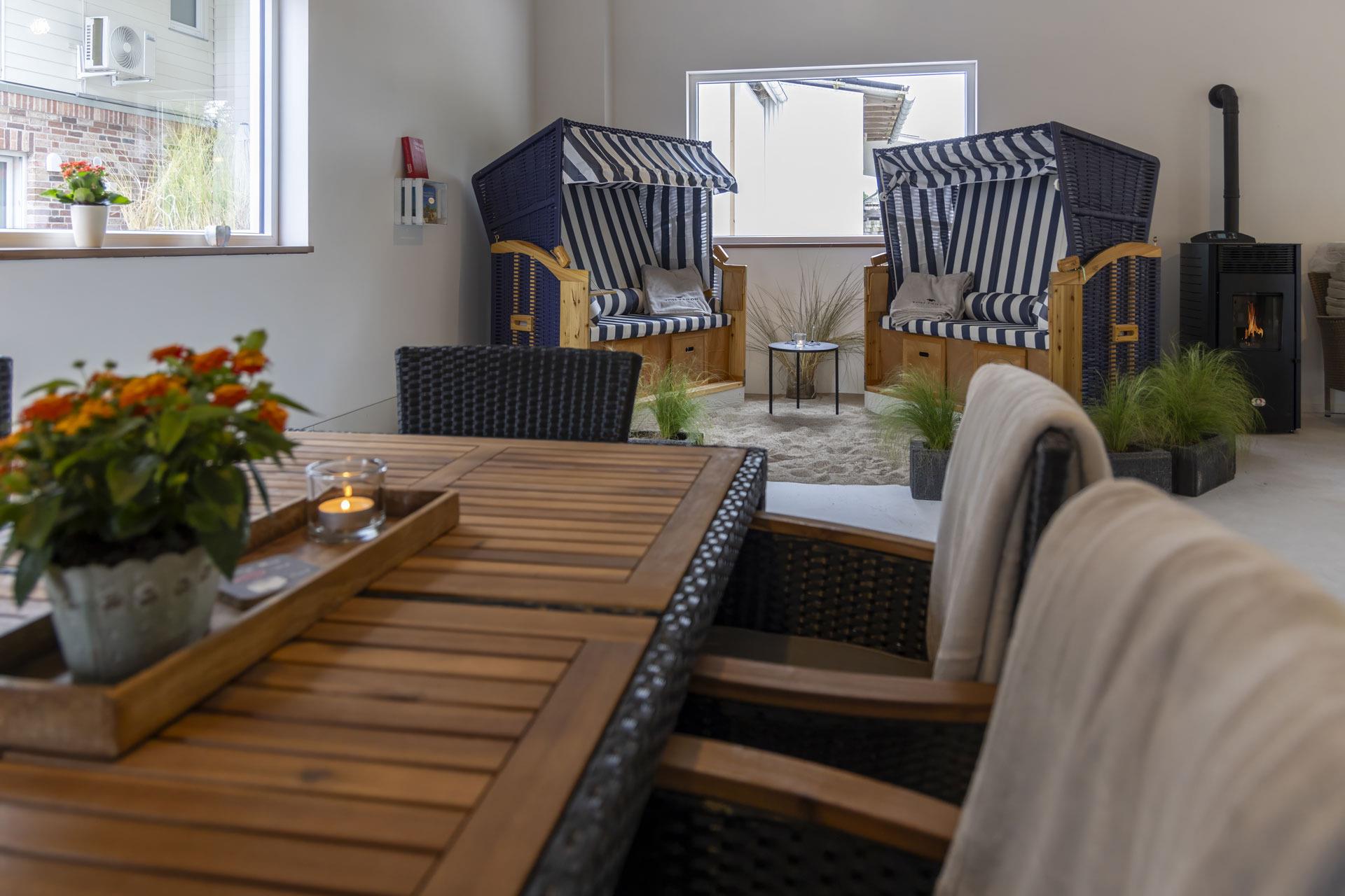Eine Fußbodenheizung sorgt im ganzen Haus für wohlige Wärme und eine Klimaanlage rundet das ganze ab. In den stilvollen Bädern finden Sie bodengleiche Duschen und Infrarotkabinen, die nach einem erfrischenden Tag an der Nordsee zum Aufwärmen einladen. Genießen Sie ein Glas Wein bei Kerzenschein und entspannen Sie anschließend im bequemen Boxspringbett, vielleicht mit einem Film auf dem großen Flachbildfernseher.