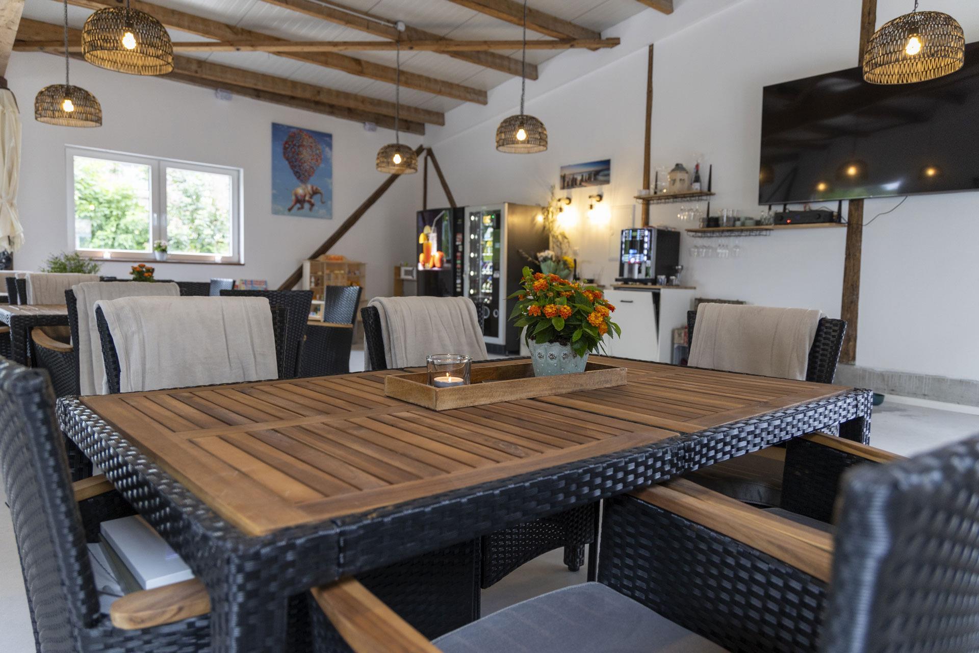 Unser Außengelände ist ebenso einladend gestaltet: Grillplätze laden zu gemütlichen Abenden im Freien ein, während Mini Shettys und Ziegen auf den Weiden grasen. Für Ihre Vierbeiner gibt es einen eingezäunten Hundefreilauf neben dem Grillplatz, sodass auch sie einen erholsamen Tag genießen können. Sollte das Wetter einmal nicht mitspielen, bietet unsere Aufenthaltshalle genügend Platz für unsere Feriengäste. Hier können Sie Snacks sowie Kalt- und Heißgetränke erwerben, und für die kleinen Besucher gibt es eine liebevoll eingerichtete Spielecke.