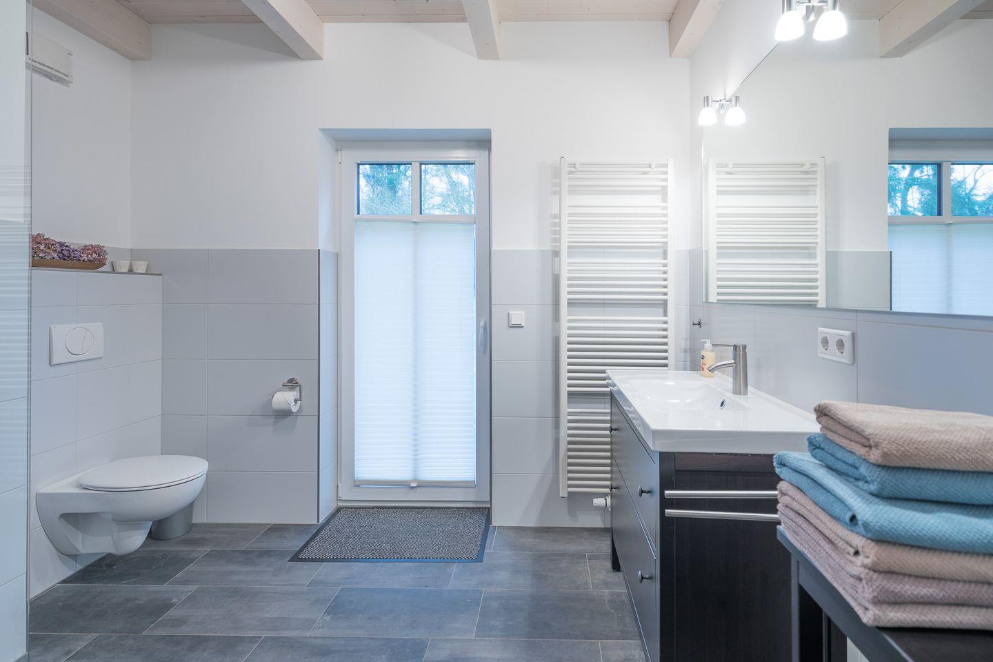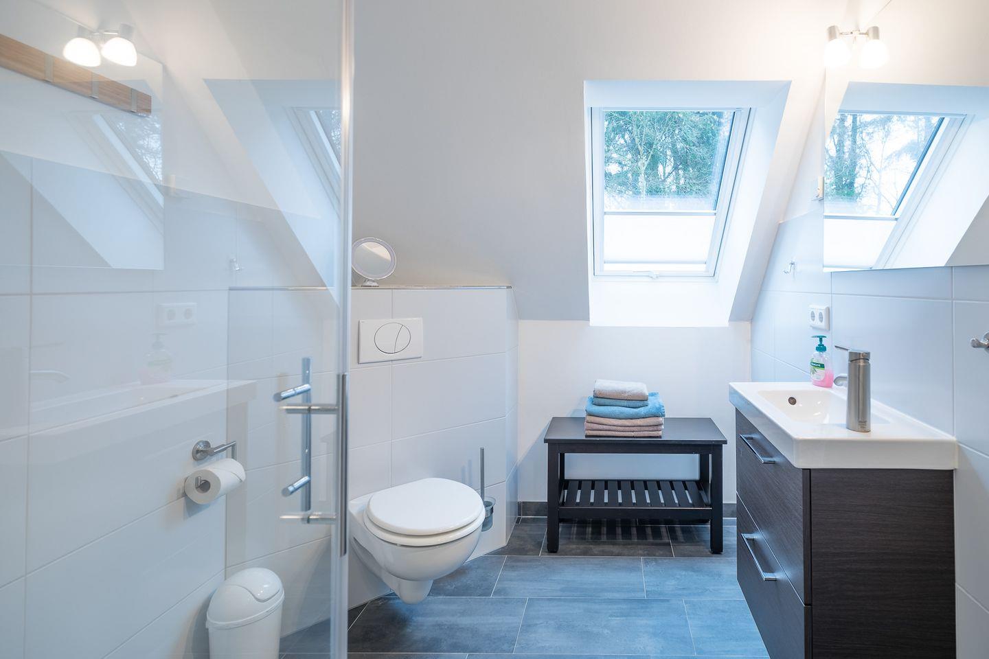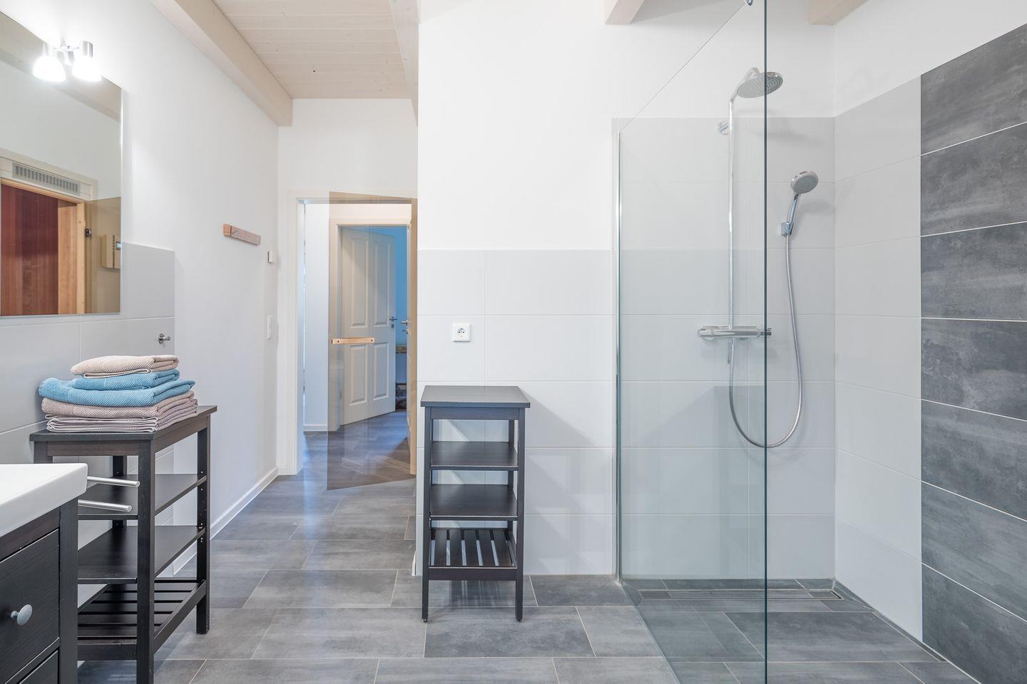 Im Erdgeschoss befindet sich ein weiteres Duschbad mit einer großzügigen Sauna. Dusch- und Handtücher sind bei Ihrer Ankunft im Haus. Wenn Sie mehr Handtücher benötigen, können Sie sie gerne gegen Aufpreis bestellen.