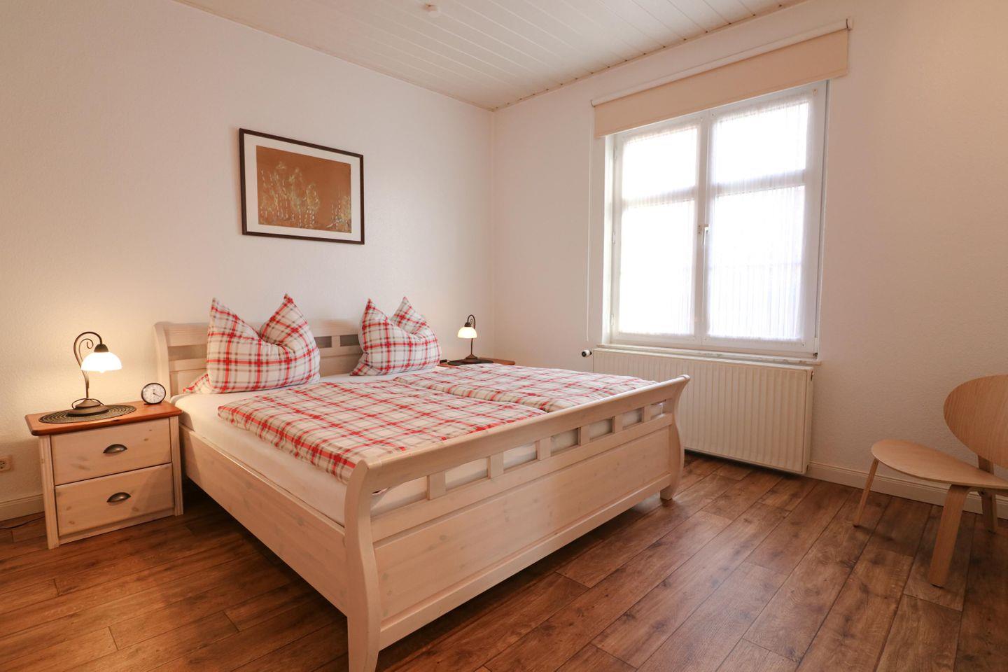 Die großzügige Raumaufteilung umfasst insgesamt zwei Zimmer. Im Schlafzimmer finden Sie ein komfortables Doppelbett (180 x 200 cm) sowie einen großzügigen Kleiderschrank, der genug Platz für Ihre Habseligkeiten bietet, während das gemütlich gestaltete Wohnzimmer mit Sessel und einer gemütlichen, einladenden Sofaecke zum Ausruhen und Verweilen einlädt. Sichtschutz an allen Fenstern sowie liebevoll ausgewählte Details wie Bücher im Wohnbereich sorgen für ein wohnliches Ambiente.