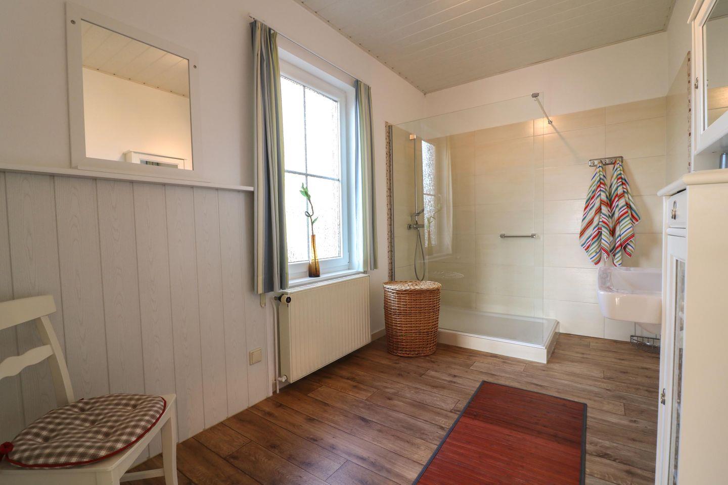 Das komfortable und geräumige Badezimmer ist mit einer großen Dusche, Spiegelschrank, Waschbecken, Fenster und einem Haartrockner ausgestattet. Das WC befindet sich separat mit einem kleinen Waschbecken im Raum nebenan.