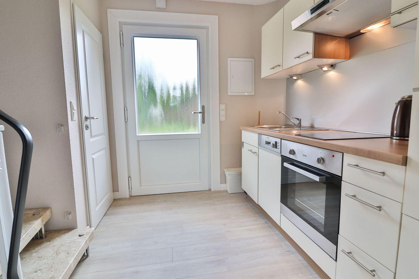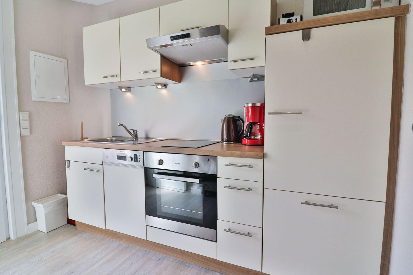 Die separate Küche, durch die Sie die Wohnung betreten, besteht aus einem 2-Platten-Ceranfeld, einem Backofen, einem Kühlschrank mit Gefrierfach und einer Spülmaschine und lässt Sie problemlos Ihre Lieblingsmahlzeiten zubereiten.