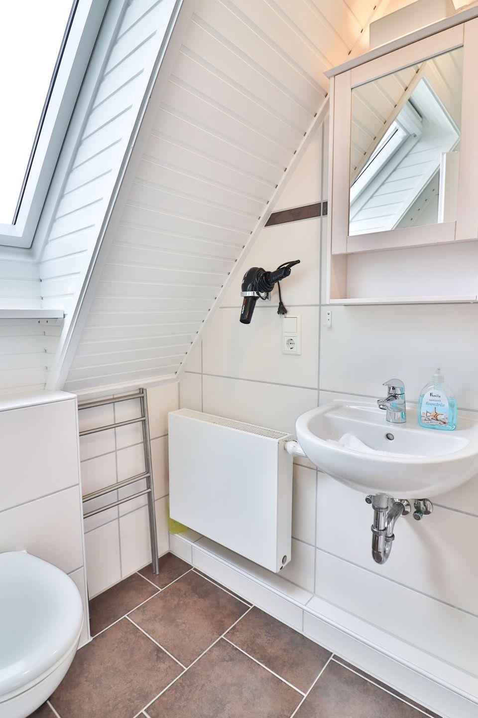 Das Badezimmer ist mit einer Dusche, einem Waschbecken, einem WC und einem Haartrockner ausgestattet. Ein weiteres WC befindet sich im Erdgeschoss.
