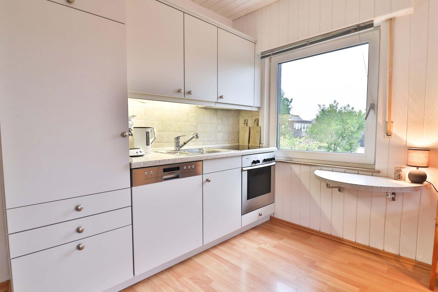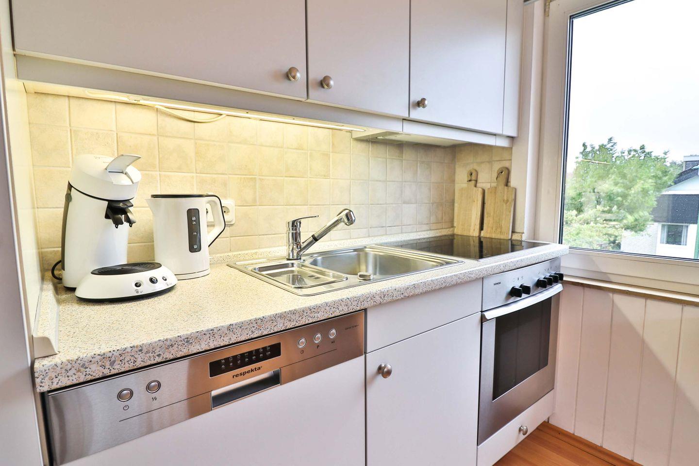 Die offene Küche ist mit modernen Geräten und umfangreichem Zubehör ausgestattet. Ihnen steht ein moderner 4-Platten-Herd, ein Backofen sowie ein Kühlschrank mit integriertem Gefrierfach zur Verfügung. Die Zubereitung von Speisen wird durch eine Spülmaschine, verschiedene Kaffeemaschinen (Senseo, Tassimo und Filter), Wasserkocher, Toaster, Mixer und vielfältige Küchenutensilien und Geschirr unterstützt.