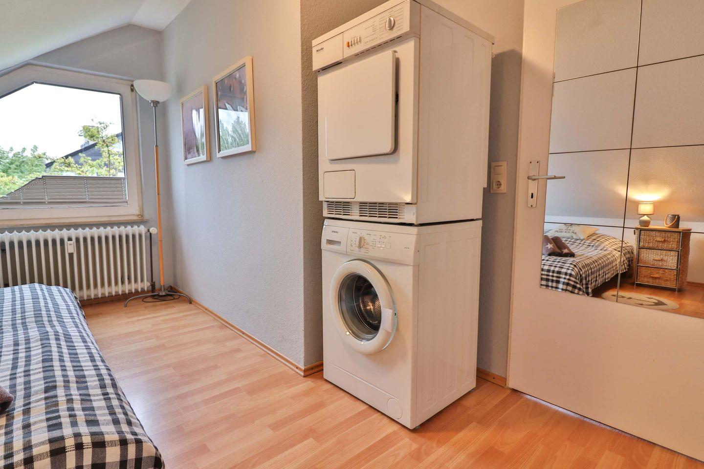Ein weiteres Plus für Familien ist die Bereitstellung eines Kinderhochstuhls sowie eines Babybetts. Babys und Kinder sind herzlich willkommen. Für längere Aufenthalte oder den Alltag bietet Ihnen die Unterkunft außerdem komfortablen Zugang zu Waschmaschine und Trockner, welche zur Eigennutzung in einem der beiden Schlafzimmer zur Verfügung stehen. Ein ergänzender Wäscheservice ist ebenfalls gegeben.
