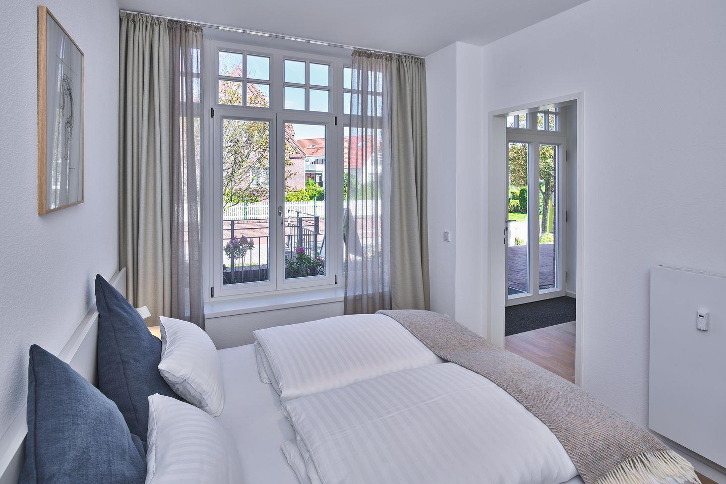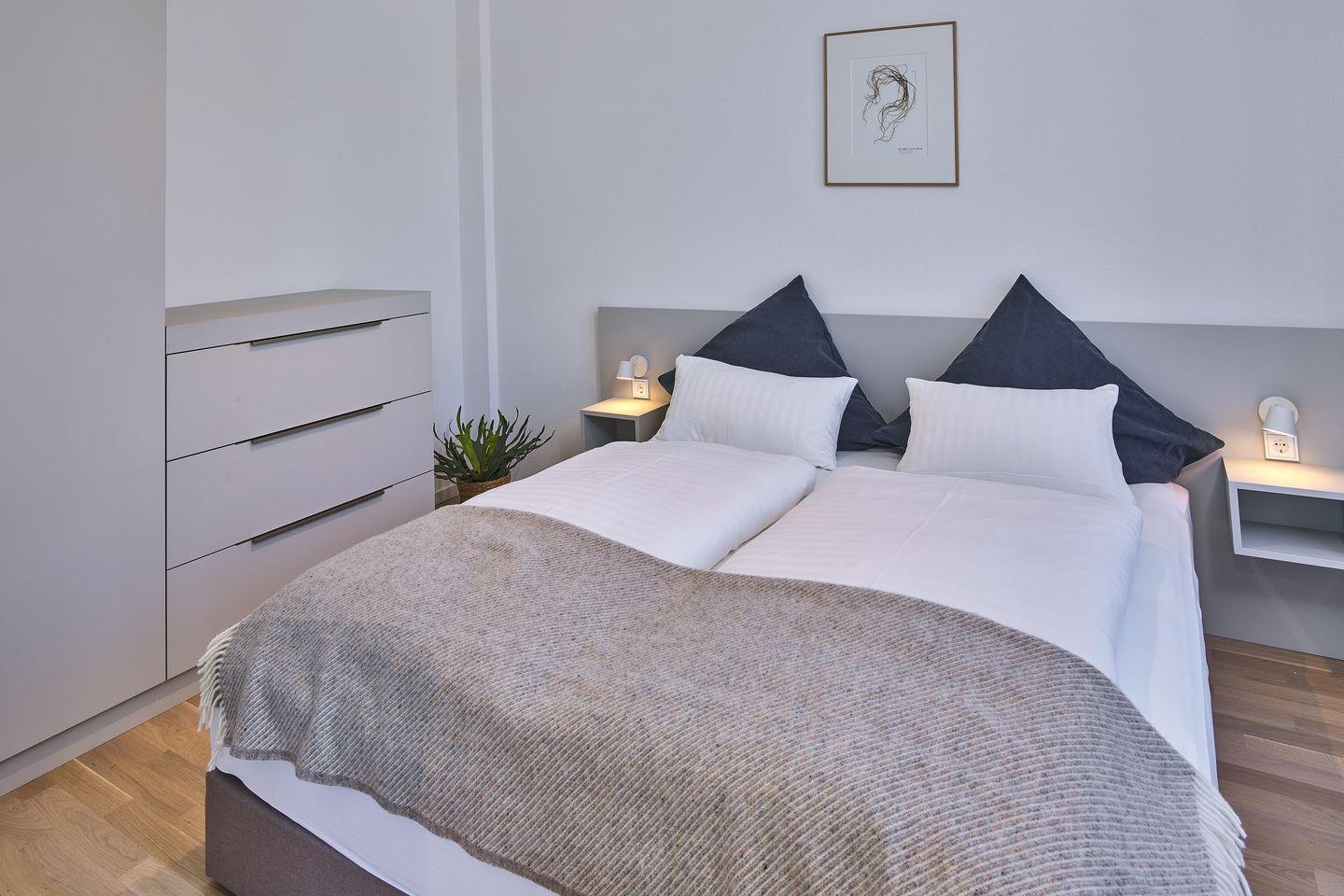 Das Schlafzimmer beinhaltet ein modernes Boxspring-Doppelbett (1,80 x 2,00 m) und einen Kleiderschrank. Das Badezimmer verfügt über Handtuchwärmer, Regendusche, WC, Waschtisch, Föhn und Kosmetikspiegel. Die behagliche Wohnung bietet Ihnen eine luxuriöse Terrasse mit Gartenmöbeln und Liegestühlen - hier könnt ihr das einmalige Meeresklima und das bunte Inseltreiben erleben und genießen.