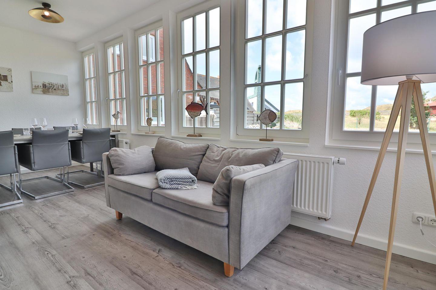 Der Wohn- und Essbereich ist großzügig gestaltet und bietet zwei bequeme Sofas und zwei Sessel, auf denen Sie sich entspannen können. Für Ihre Unterhaltung gibt es einen großen Fernseher. Der Essbereich verfügt über einen Esstisch mit Stühlen und bietet einen wunderschönen Ausblick auf den Wasserturm und die malerischen Dünen.