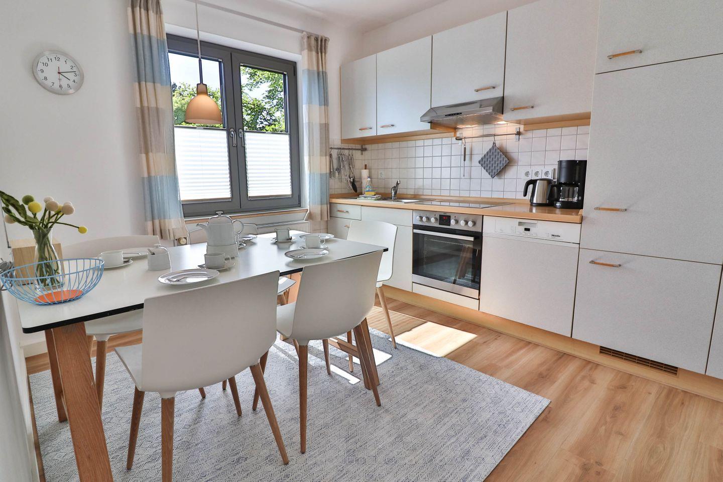 Die voll ausgestattete Küche lädt zum gemeinsamen Kochen ein und bietet alles, was Sie benötigen: von einem 4-Platten-Ceranfeld über Backofen, Spülmaschine, Kühlschrank mit Gefrierfach, Mikrowelle bis hin zur Kaffeemaschine (wahlweise Filter oder Senseo), Wasserkocher, Toaster und Handrührgerät. Darüber hinaus stehen Ihnen viele weitere Küchenutensilien zur Verfügung, um kulinarische Köstlichkeiten zuzubereiten. Ein Radio rundet die Ausstattung ab.