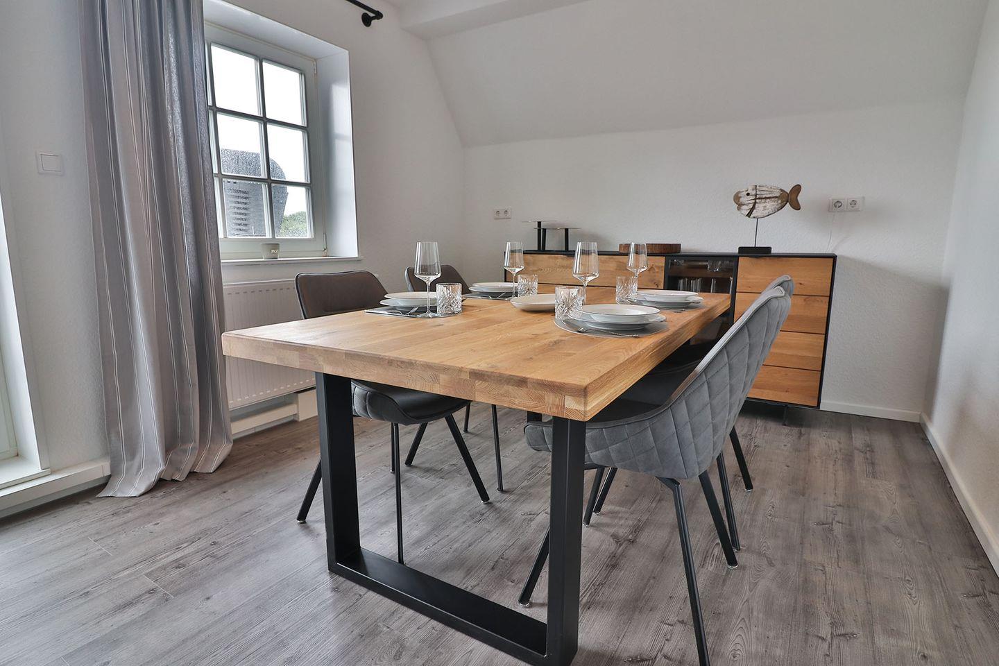 Das Wohn- und Esszimmer lädt mit seinem gemütlichen Wohnbereich zum Verweilen ein. Zwei bequeme Sessel und ein Sofa bieten genügend Sitzmöglichkeiten für entspannte Abende vor dem Fernseher oder mit einem guten Buch. Der große Esstisch ist perfekt für gesellige Mahlzeiten oder gemütliche Spieleabende.