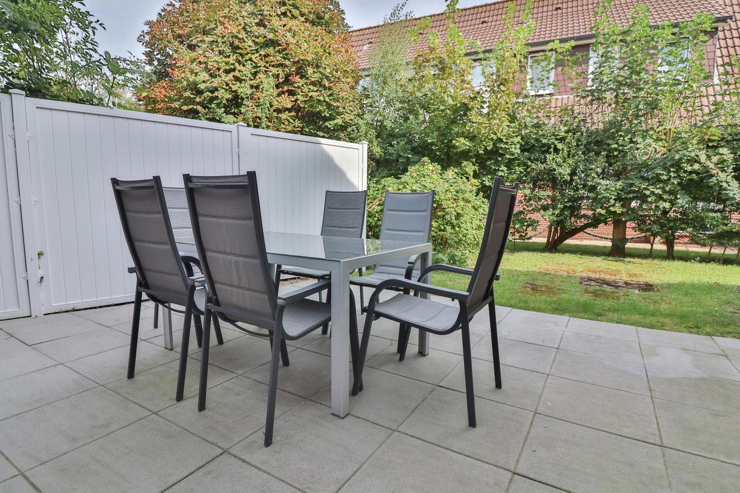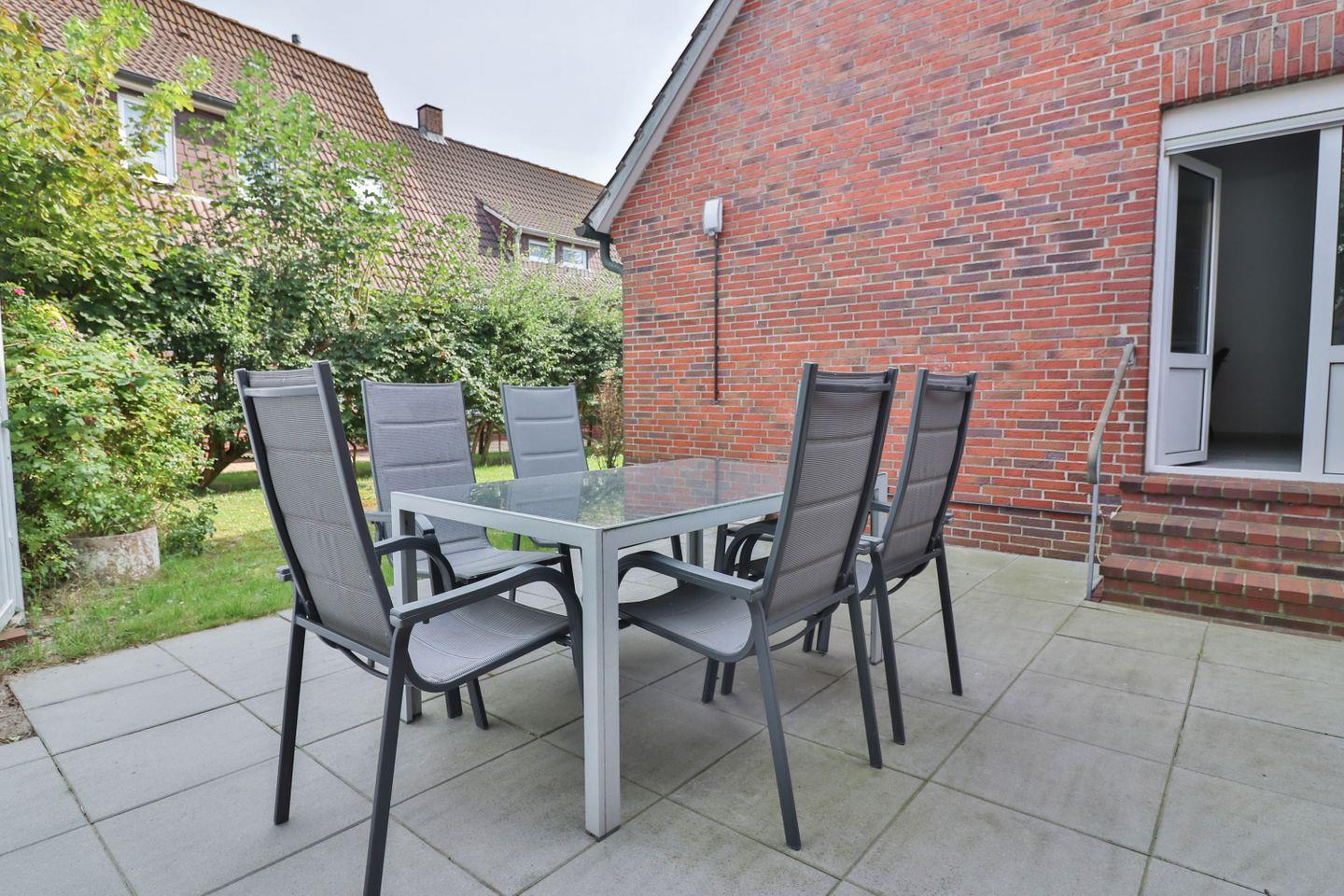 Ein besonderes Highlight ist der direkte Zugang vom Wohnzimmer zur eigenen Terrasse. Genießen Sie hier die frische Nordseeluft bei einem Frühstück im Freien oder einem entspannten Abendessen. Die Terrasse ist mit einem Tisch und bequemen Stühlen ausgestattet – der perfekte Ort, um die Seele baumeln zu lassen.