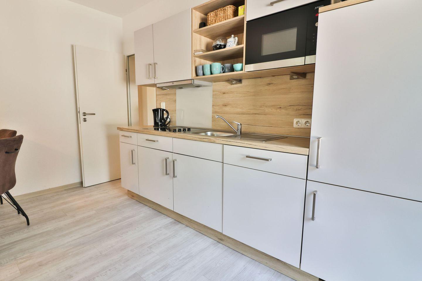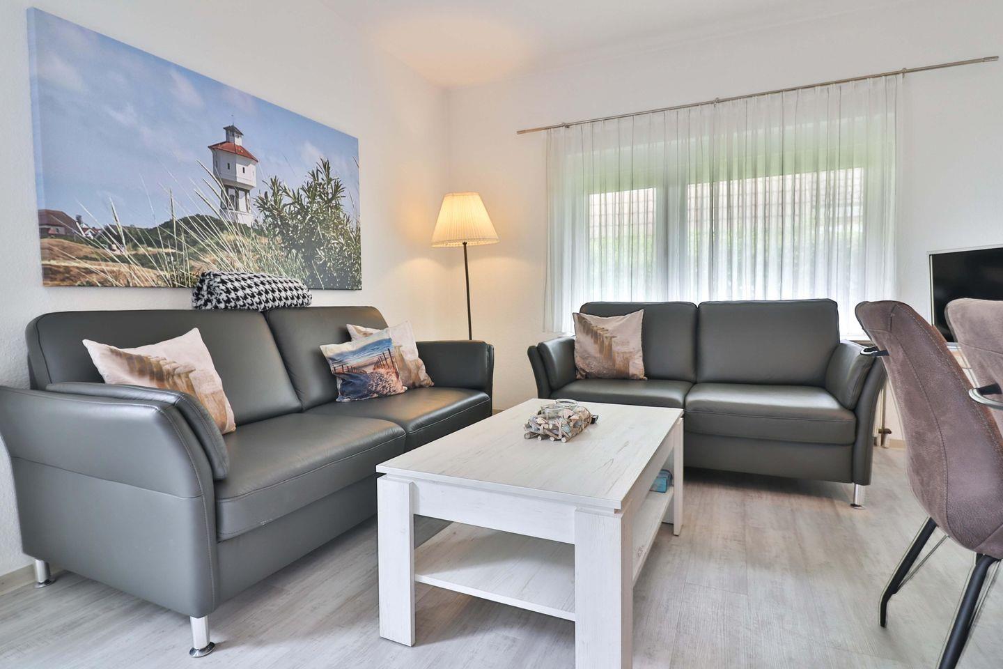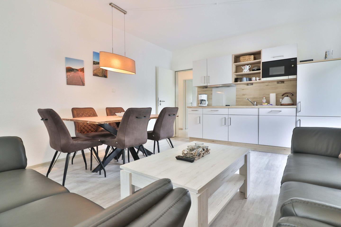 Das Herzstück der Ferienwohnung Robbe ist das großzügige Wohn- und Esszimmer mit integrierter Küchenzeile. Sie ist ausgestattet mit einem Ceranfeld, einer Mikrowelle, einem Kühlschrank, einer Spülmaschine, einer Kaffeemaschine, einem Wasserkocher, einem Toaster, einem Eierkocher und weiteren Küchenutensilien. Der Wohnbereich lädt mit zwei gemütlichen Sofas und einem Fernseher zum Entspannen ein, während der Essbereich genügend Platz für gemeinsame Mahlzeiten bietet.
