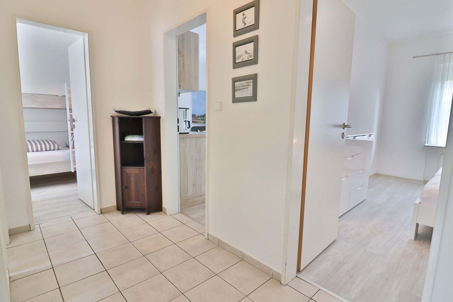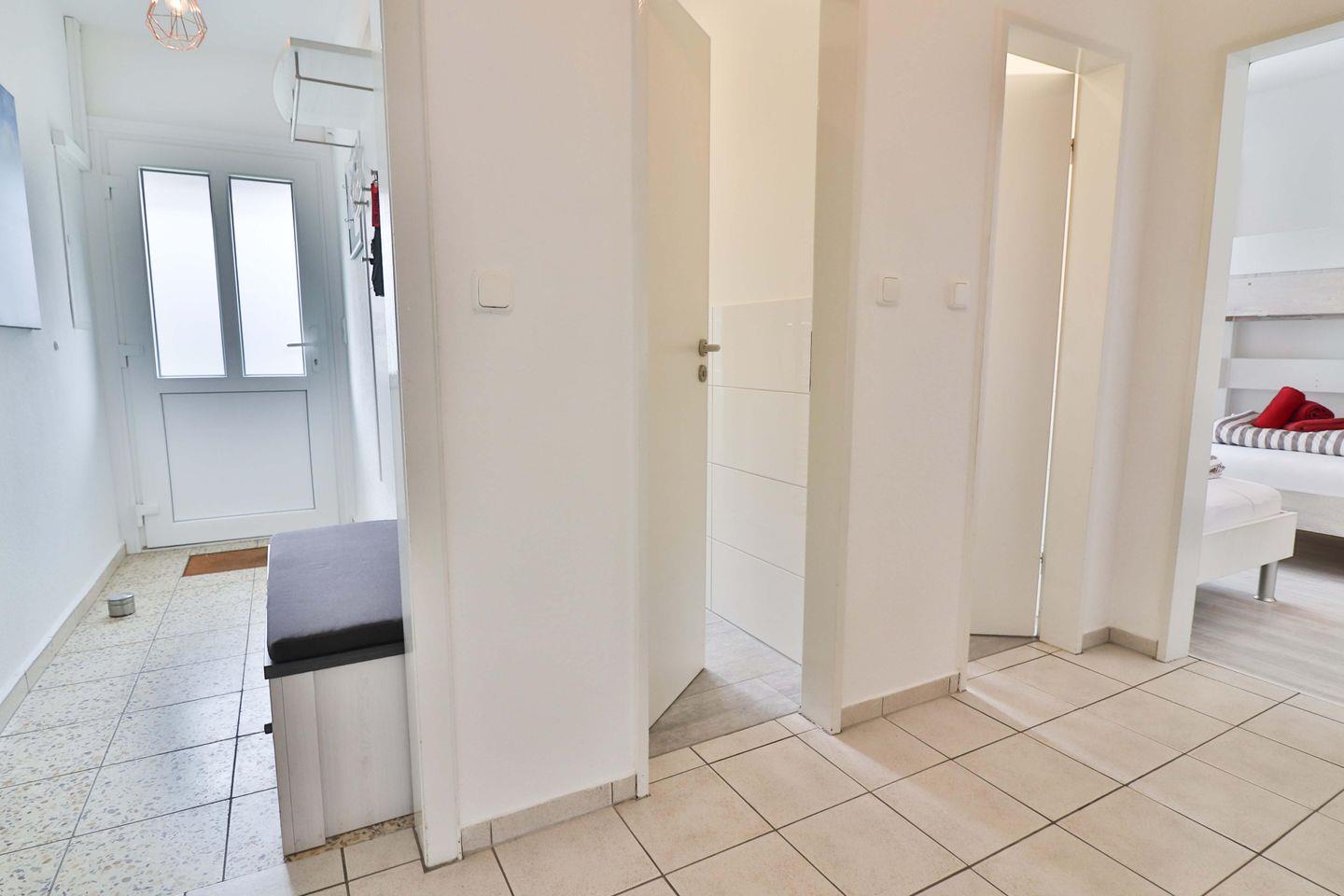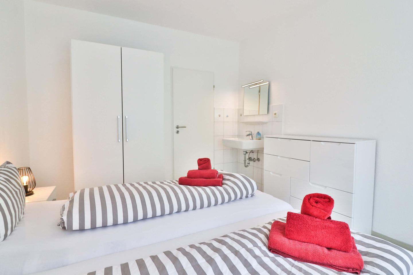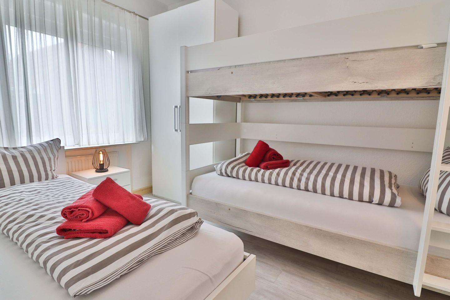 Die Wohnung verfügt über zwei Schlafzimmer. Im ersten Schlafzimmer erwartet Sie ein komfortables Doppelbett (180 x 200 cm), sowie ein geräumiger Kleiderschrank, eine Kommode und ein praktisches Waschbecken. Das zweite Schlafzimmer ist perfekt für Kinder oder weitere Gäste eingerichtet, mit einem Etagenbett, einem zusätzlichen Einzelbett (alle je 90 x 200 cm), ebenfalls einem Kleiderschrank und einem Waschbecken.