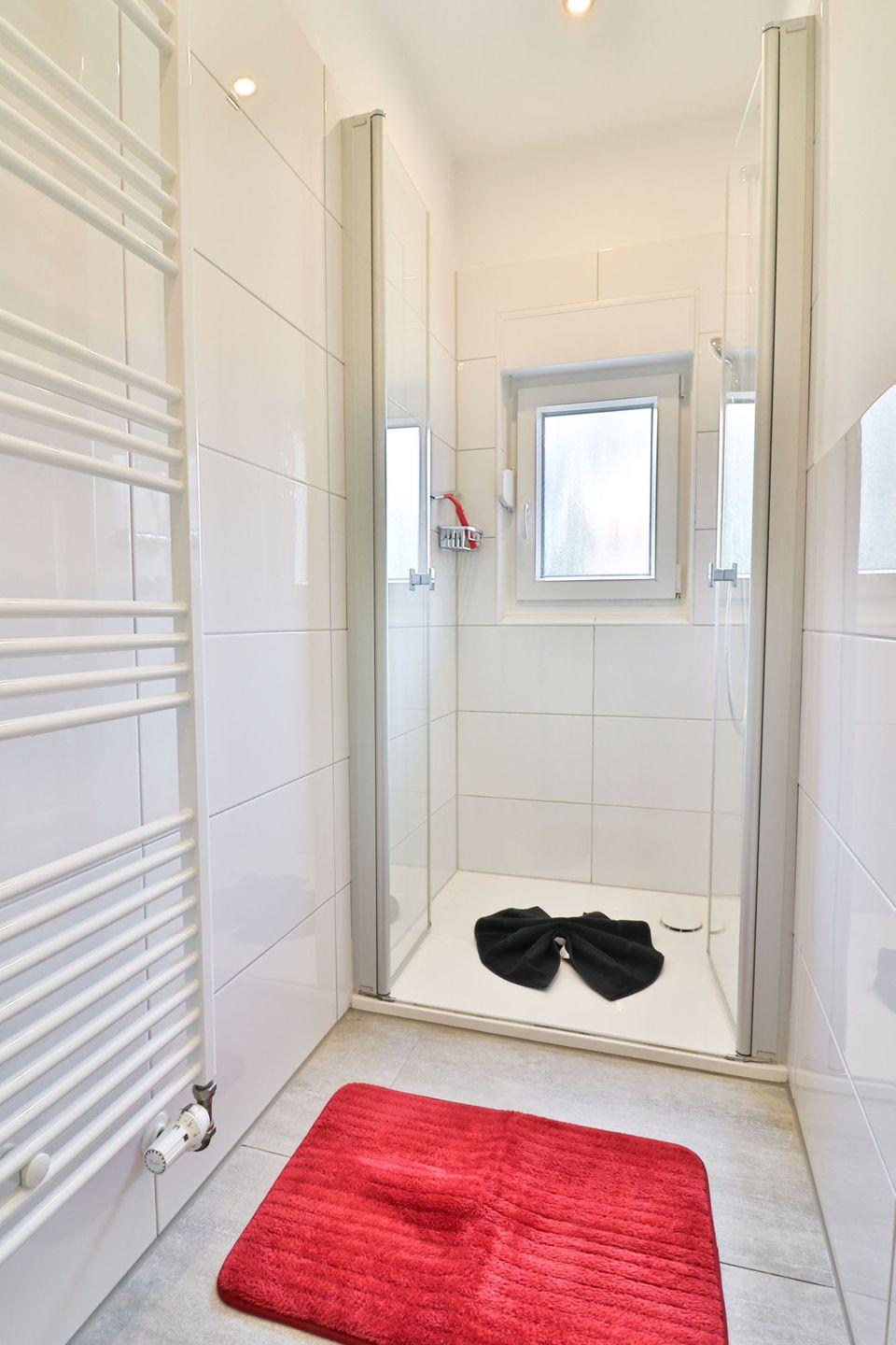 Das Badezimmer der Wohnung ist modern gestaltet und verfügt über eine Dusche sowie eine praktische Handtuchheizung. Ein separates WC sorgt für zusätzlichen Komfort.