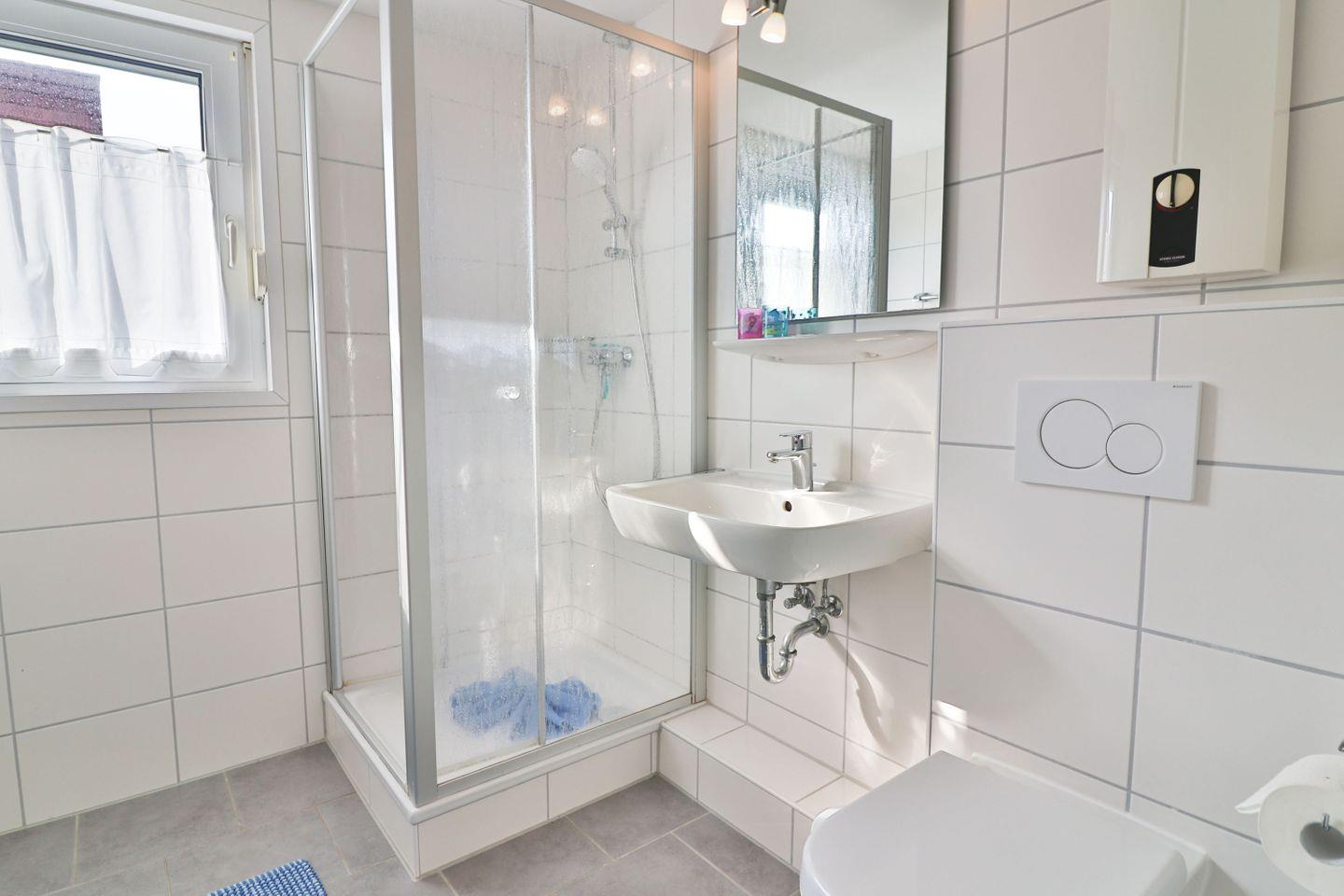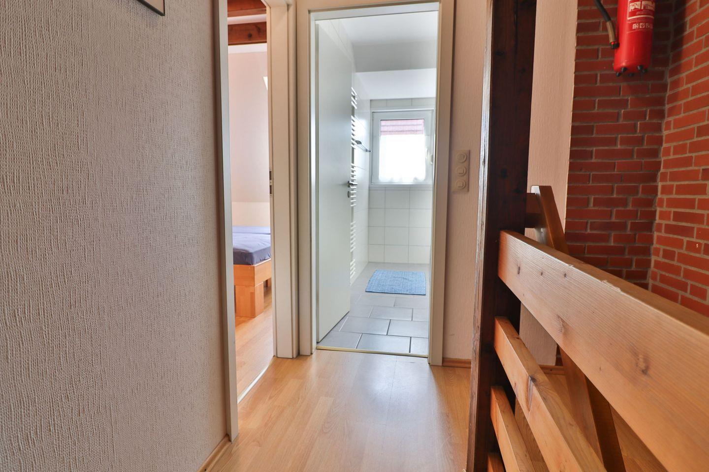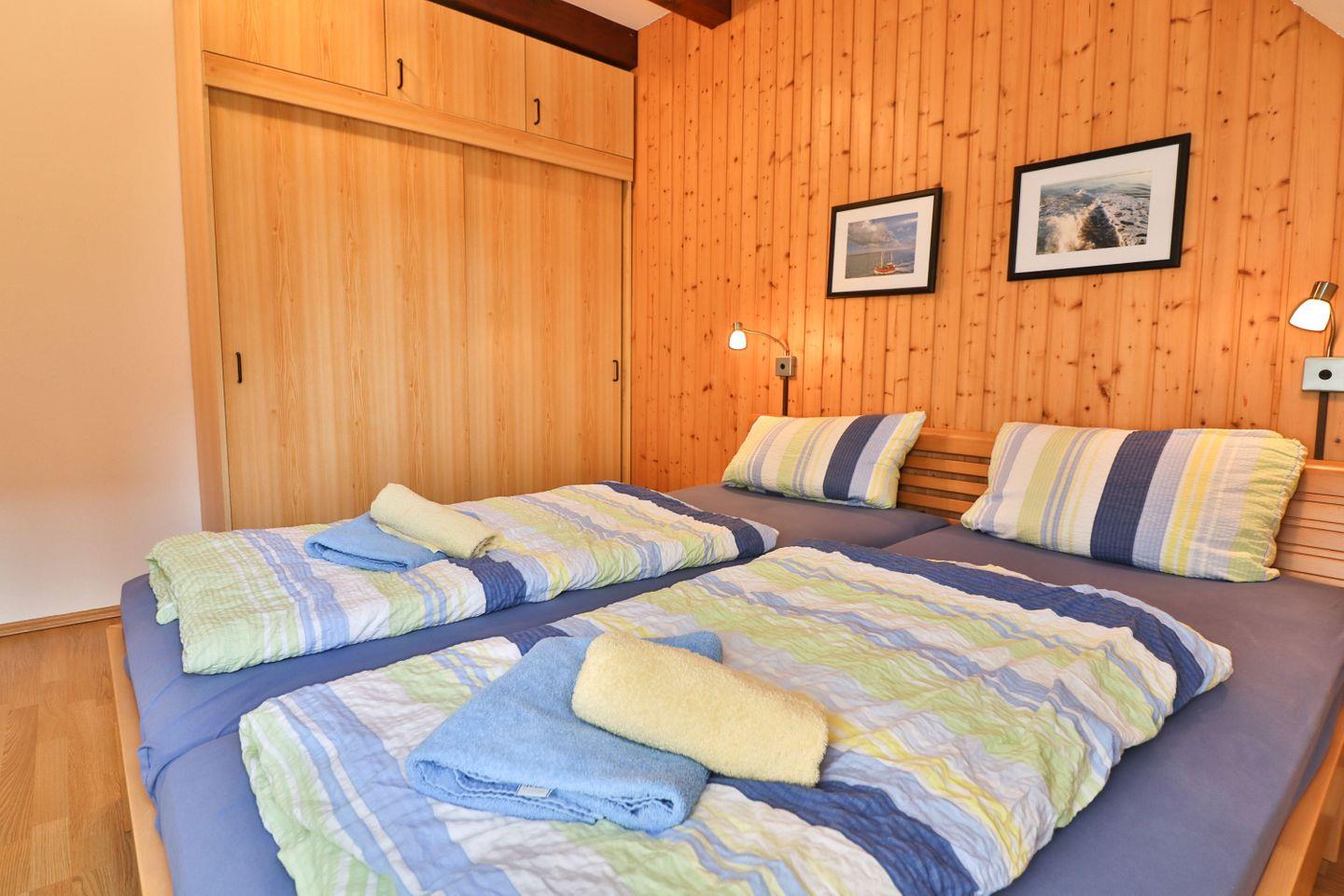 Das Obergeschoss beherbergt zwei Schlafzimmer und ein Badezimmer. Das erste Schlafzimmer ist mit einem Doppelbett (180 x 200 cm) und einem geräumigen Kleiderschrank ausgestattet, während das zweite Zimmer über zwei Einzelbetten (1x 90 x 190, 1x 90 x 200 cm), ebenfalls einen Kleiderschrank sowie einen Schreibtisch verfügt. Beide Schlafzimmer sind mit praktischen Außenrollos versehen, die für eine angenehme Verdunkelung sorgen. Das moderne Badezimmer bietet eine Dusche, ein Waschbecken, eine Toilette sowie eine Waschmaschine, die den Gästen kostenfrei zur Verfügung steht.