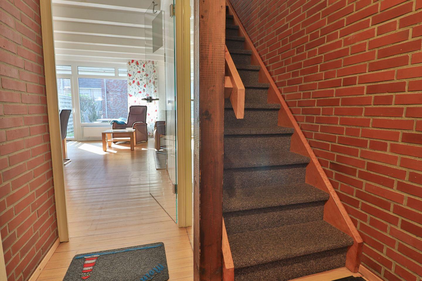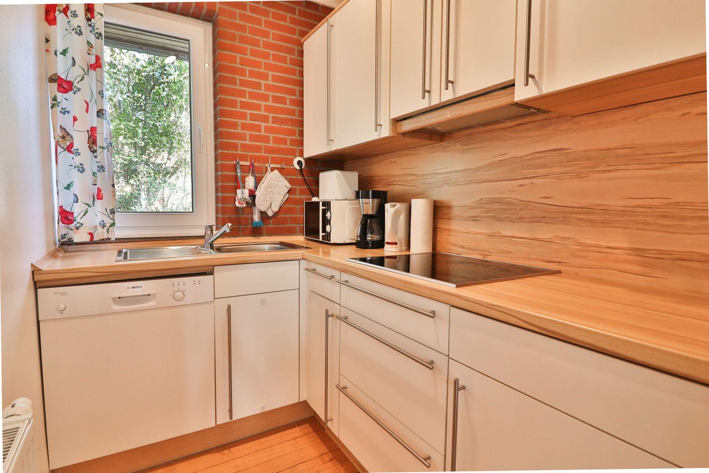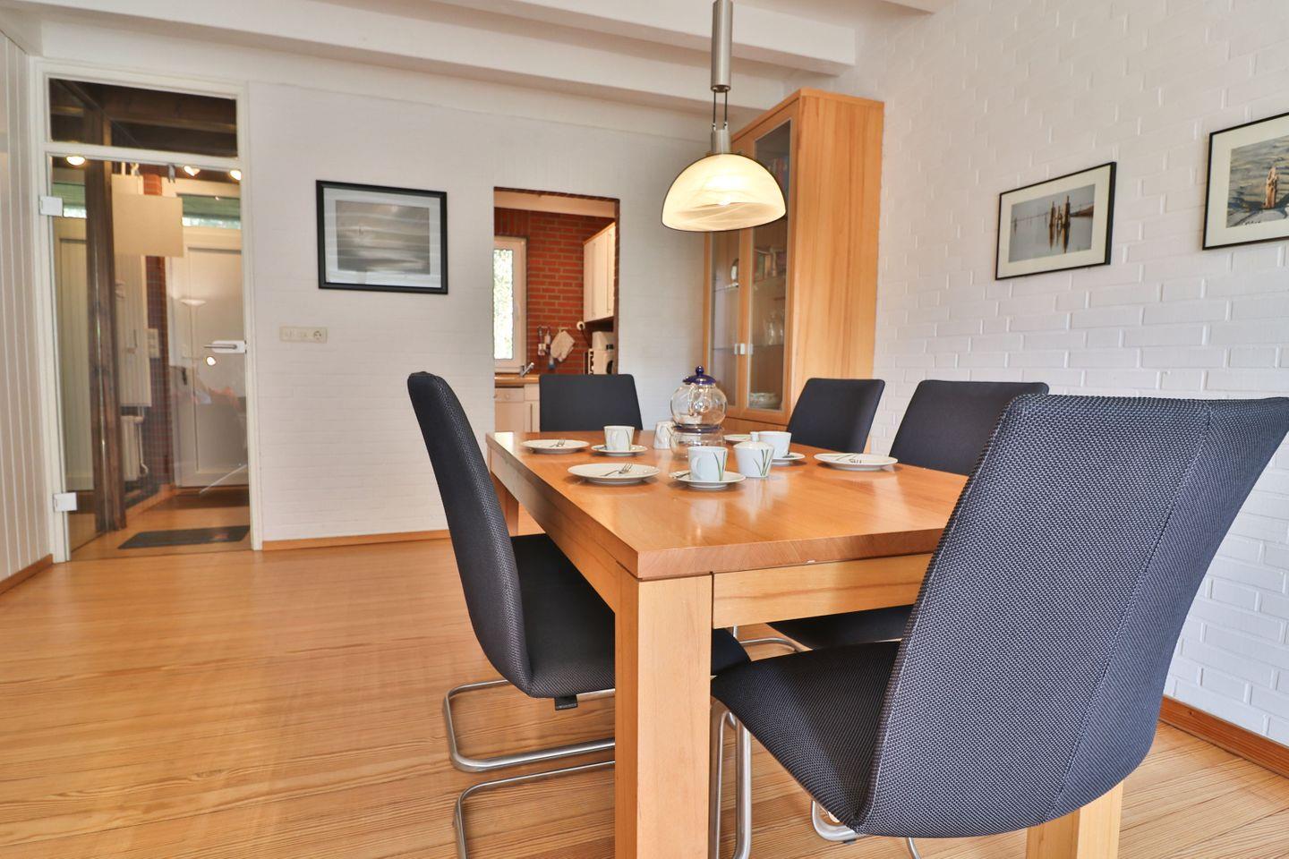 Im Erdgeschoss befindet sich das großzügige Wohnzimmer, das mit einem Kamin, Fernseher und einem einladenden Essbereich ausgestattet ist. Die angrenzende Küche bietet alles, was man für die Selbstversorgung im Urlaub benötigt. Vom Wohnzimmer aus gelangt man direkt auf die Westterrasse, die mit Gartenmöbeln und einem Rasenanteil zum Verweilen einlädt. Zusätzlich gibt es im Erdgeschoss ein Gäste-WC, das sich direkt neben dem Eingang befindet.