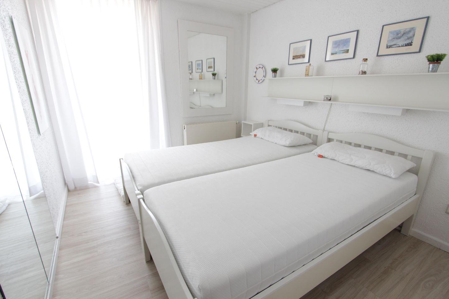 OG: 2 Schlafzimmer und das Tageslichtbadezimmer. 1 Schlafzimmer mit Doppelbett 180 cm x 200 cm Liegefläche und großen Einbauschränken. 1 Schlafzimmer mit Etagenbett 90 cm x 200 cm Liegefläche mit Übergang zum Balkon. Badezimmer mit Dusche und WC, inkl. WLAN
