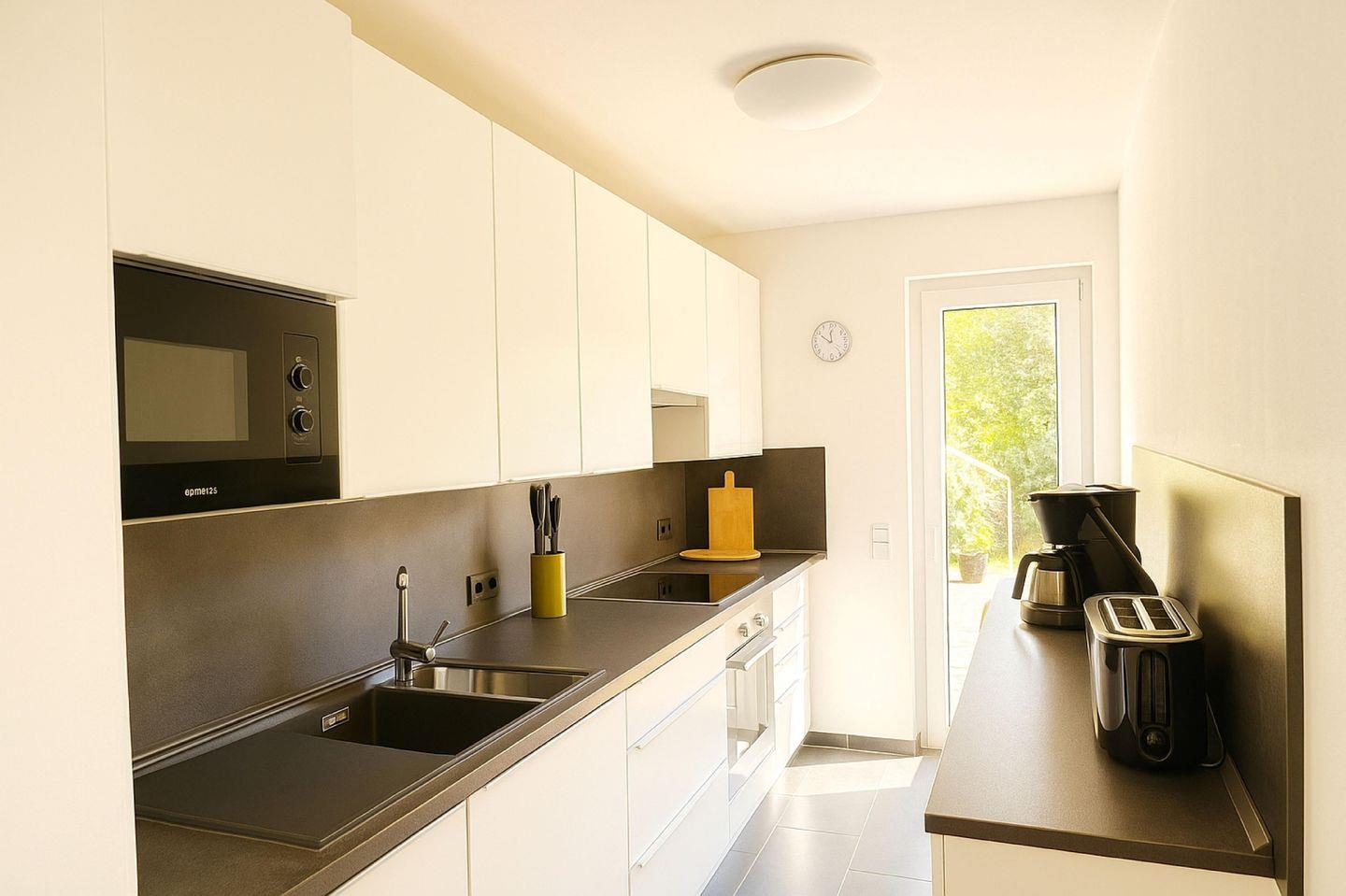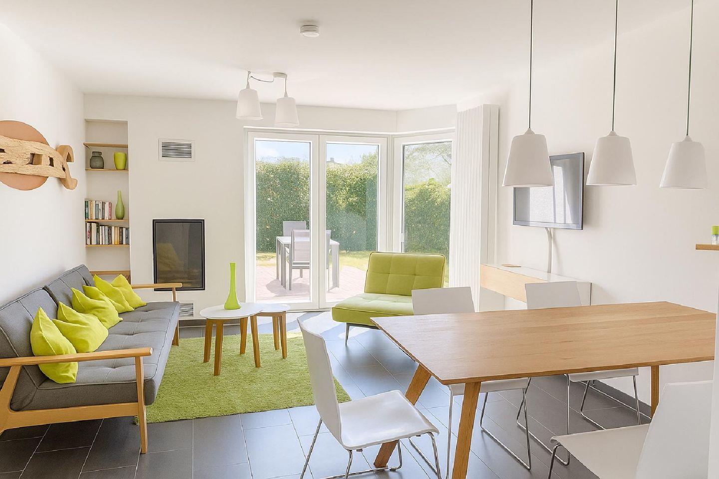EG: Wohnraum mit Gaskamin, großem Flachbildschirm, Blu-Ray Player mit Streaming Funktion (u.a. Netflix, Amazon Video), Bluetooth Stereo-Micro-Anlage für MP3 CD mit USB-Anschluss und Radio, Esstisch für 8 Personen. Sofa mit Schlaffunktion für eine Person. Zugang zur Terrasse. Separate Küche mit Ausgang zur windgeschützten Terrasse. Ausgestattet mit Geschirrspüler, Ceranfeld, Backofen, Mikrowelle, großem Kühlschrank mit Gefrierschubladen, Kaffeemaschine, Pad-Kaffeemaschine, Wasserkocher, Toaster, Handmixer, Pürierstab.