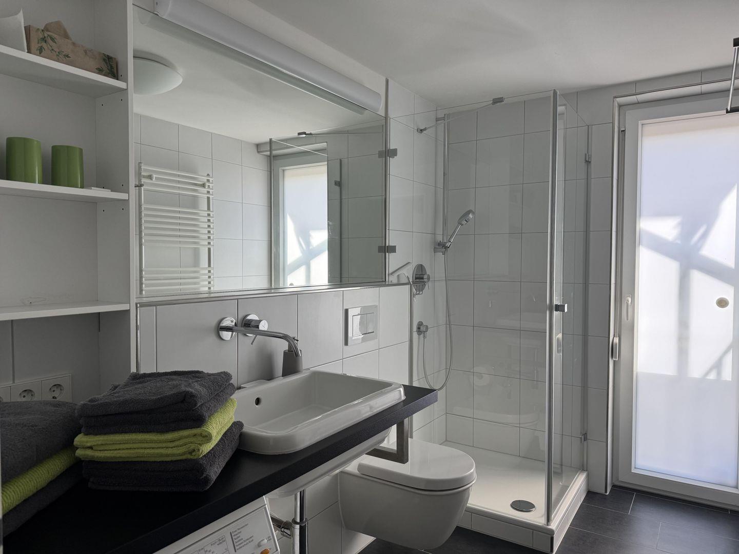 Waschmaschine, Trockner, Wäschereck, Bügelbrett-und eisen stehen zur Verfügung.