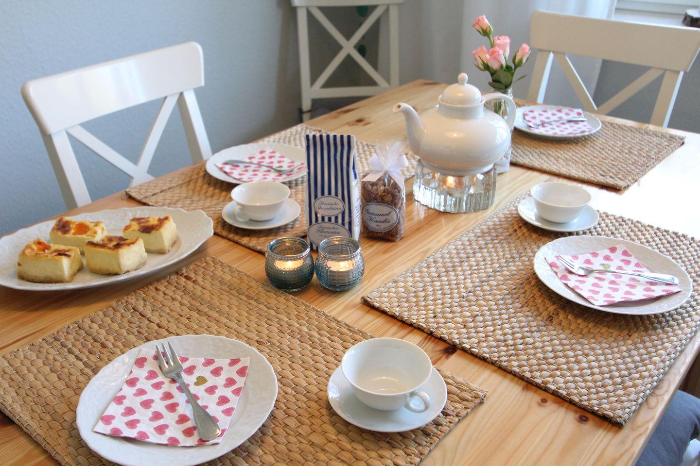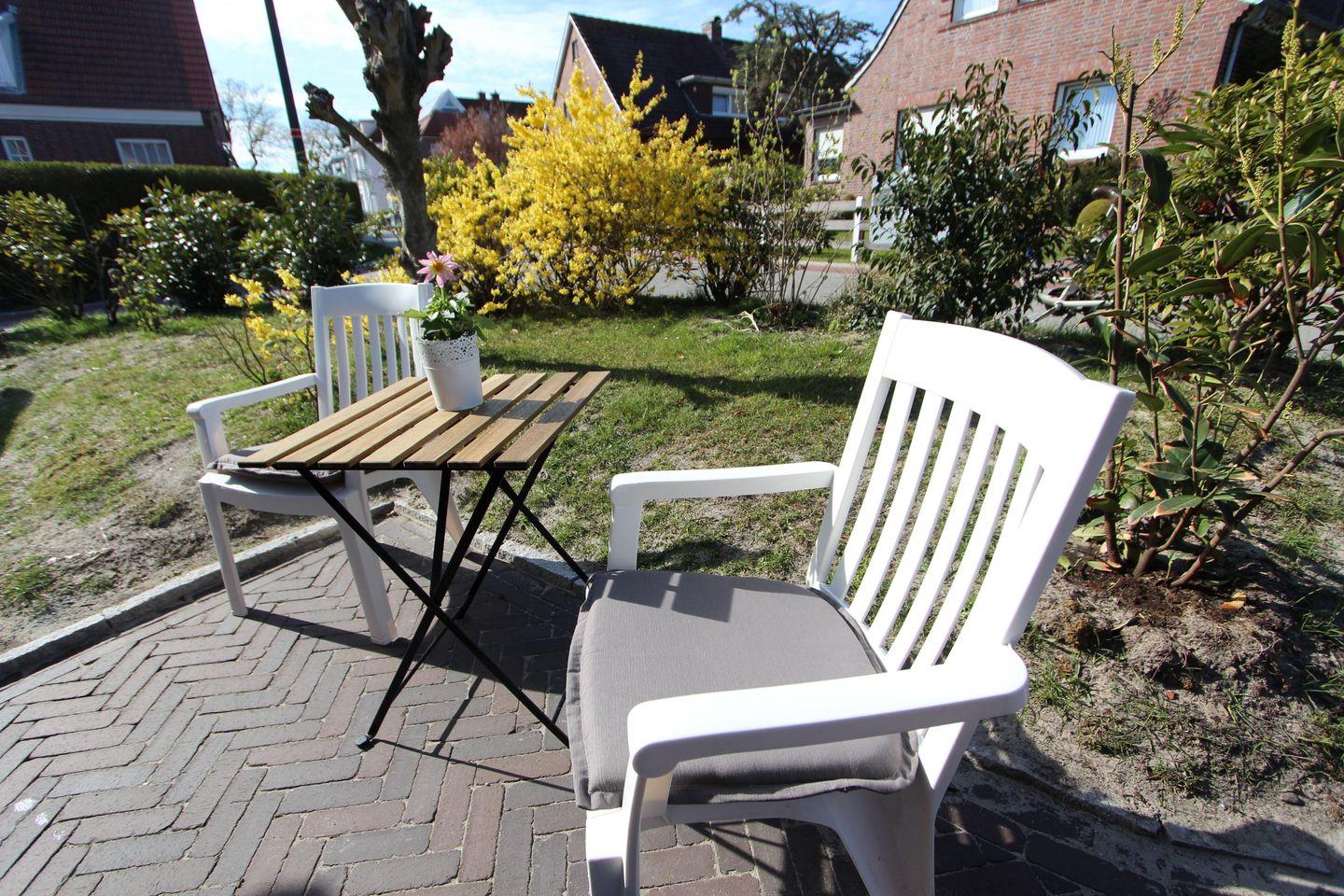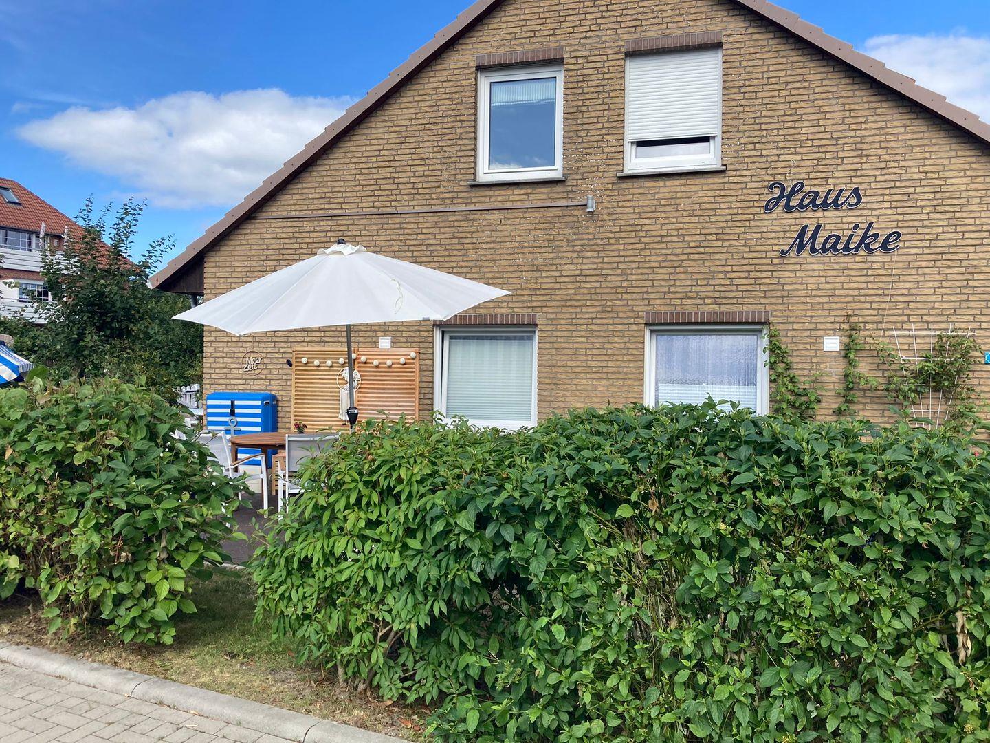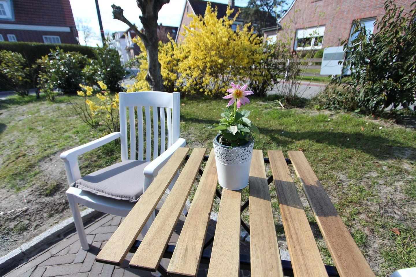 Auf der Terrasse steht für Sie ein Strandkorb mit Tisch und Stühlen bereit.