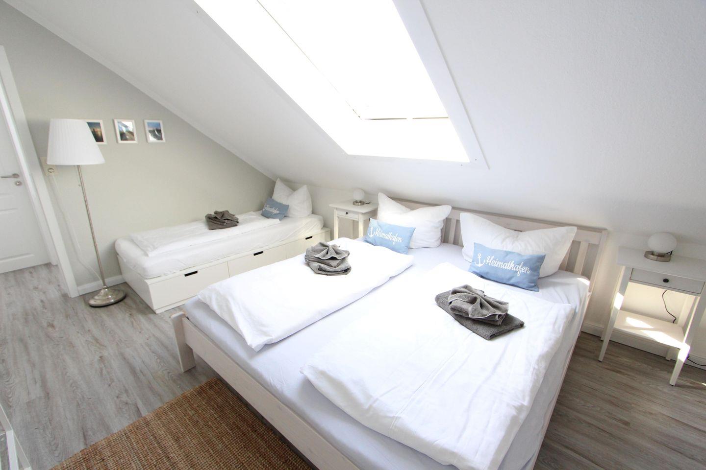 Im Obergeschoss/Dachgeschoss befinden sich die beiden geräumigen Schlafzimmer. Ein Schlafzimmer mit großem Doppelbett 1,80 m x 2,00 m und einem Einzelbett 0,90 m x 2,00 m. Das zweite Schlafzimmer hat 2 Einzelbetten mit je 0,90 m x 2,00 m.