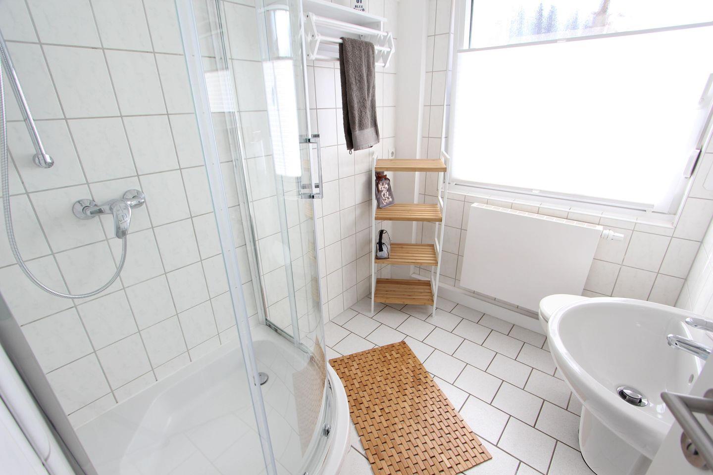 Das Badezimmer verfügt über eine Dusche und WC.