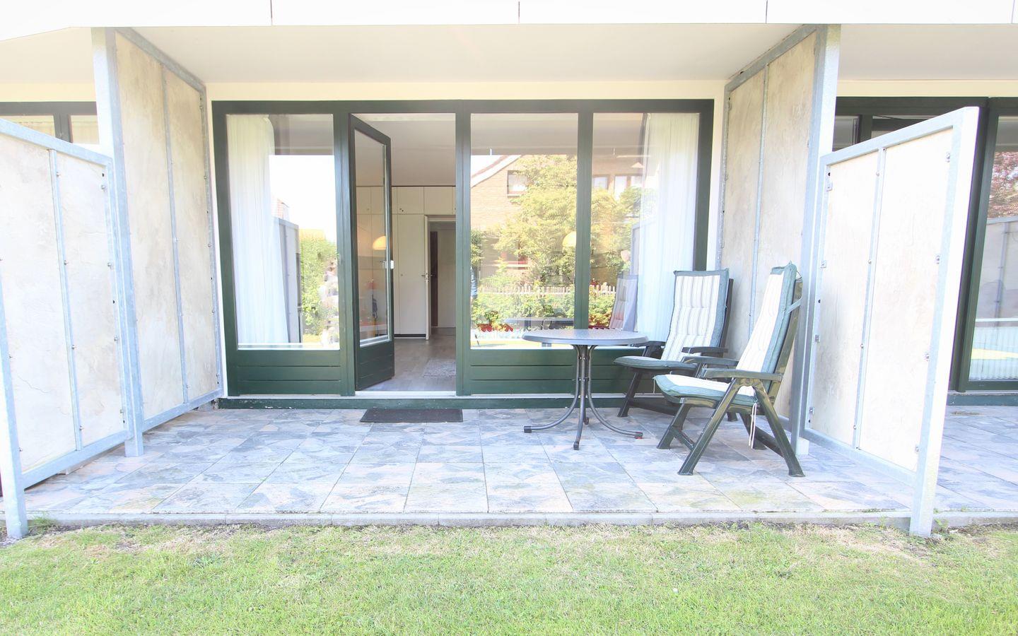 Auf der überdachten Terrasse stehen in den warmen Monaten Terrassenmöbel mit Auflagen für Sie bereit.