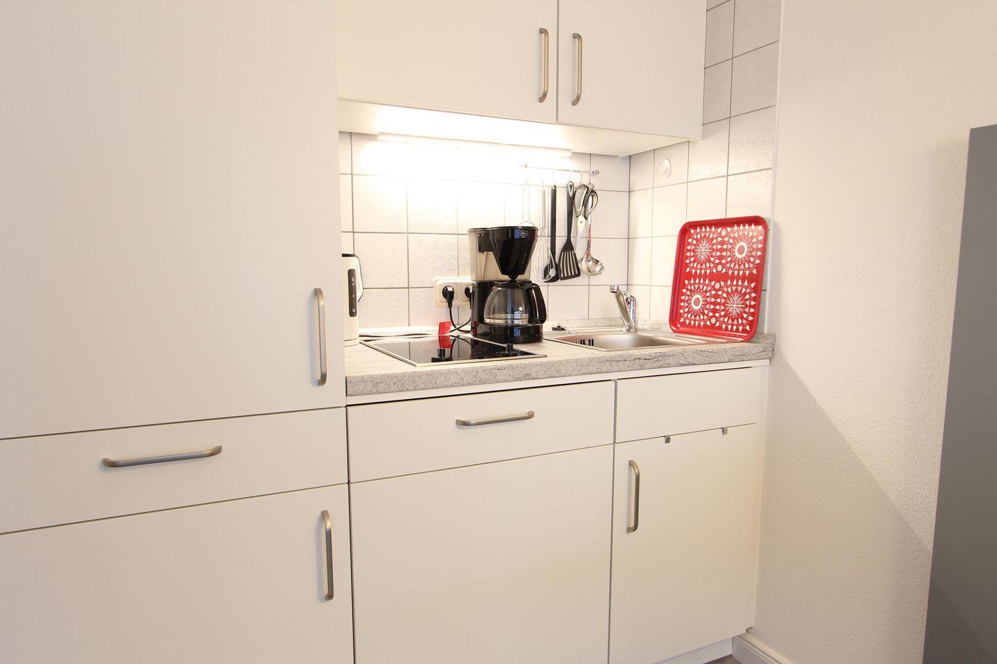 Küchenzeile: Cerankochfeld, Kühlschrank mit Gefrierfach, Geschirrspüler.