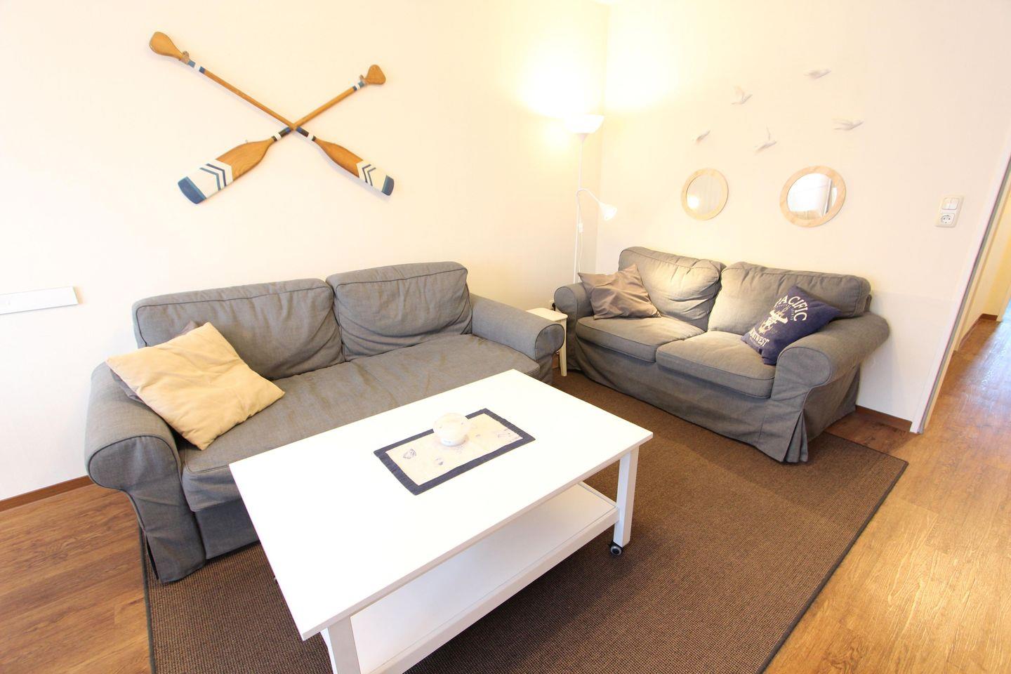 Im Wohnzimmer befindet sich ein großzügiger Esstisch und die gemütliche Couchecke mit einer Schlafcouch.