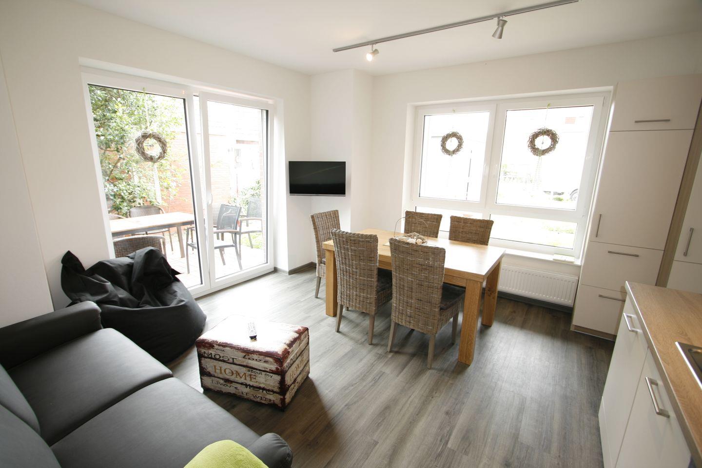 Hochwertig ausgestattete Ferienwohnung, 45 m², mit Terrasse und einer Wohnküche mit Essgelegenheit. Wohnküche mit bequemer Couch und Flachbildfernseher, ausgestattete Einbauküche mit Cerankochfeld, Geschirrspülmaschine, Backofen, Kaffeemaschine und Wasserkocher. Zwei Schlafzimmer (ein Doppelbett und 2 Einzelbetten), modernes Bad mit Dusche und WC. Waschmaschine und Trockner sowie eine kostenpflichtige Sauna befindet sich im Keller des Hauses.