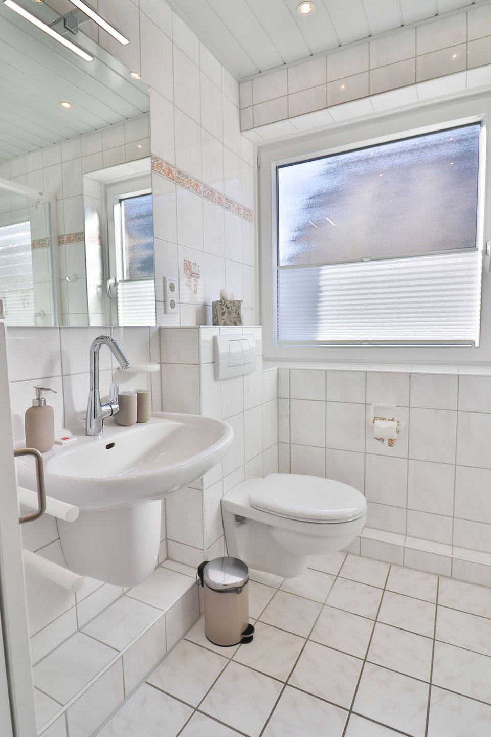 Das helle Tageslichtbad verfügt über eine Dusche, WC, Waschbecken und eine Handtuchheizung für extra Komfort.