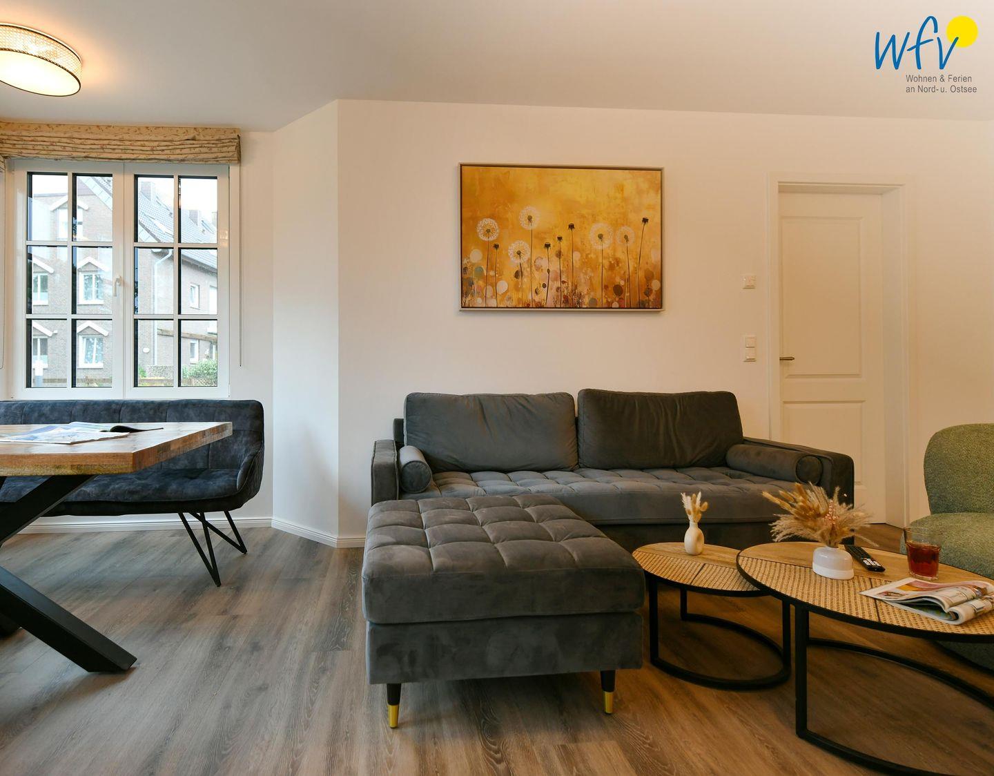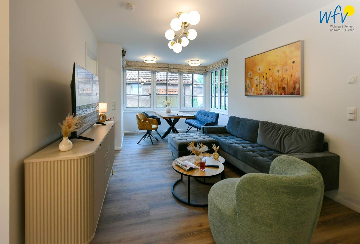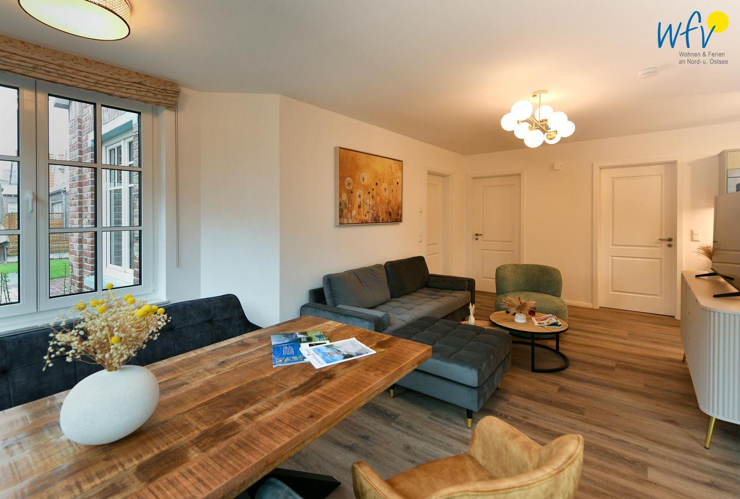 Die Ferienwohnung verfügt über ein modernes, offenes Wohnkonzept, das für ein weites Raumgefühl sorgt. Wohnbereich und Küche sind harmonisch miteinander verbunden, sodass Sie hier nach dem Strandtag oder der Fahrradtour gemütliche Abende auf dem bequemen Sofa verbringen, fernsehen und lesen können oder das gemeinsame Kochen genießen. Für kulinarische Erlebnisse ist die moderne Küche mit einem 4-Platten-Induktionsherd, einem Backofen, einer Mikrowelle, einem Kühlschrank sowie einer Spülmaschine ausgestattet. Als Kaffeeliebhaber können Sie zwischen einer klassischen Filterkaffeemaschine und einer Siebträger-Espressomaschine wählen. Der Essbereich mit breiter Fensterfront und schönem Lichteinfall lädt zu entspannten Mahlzeiten ein.