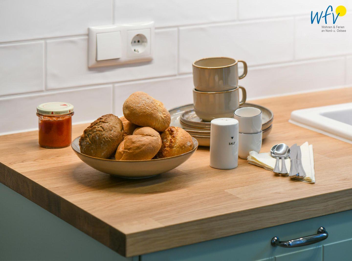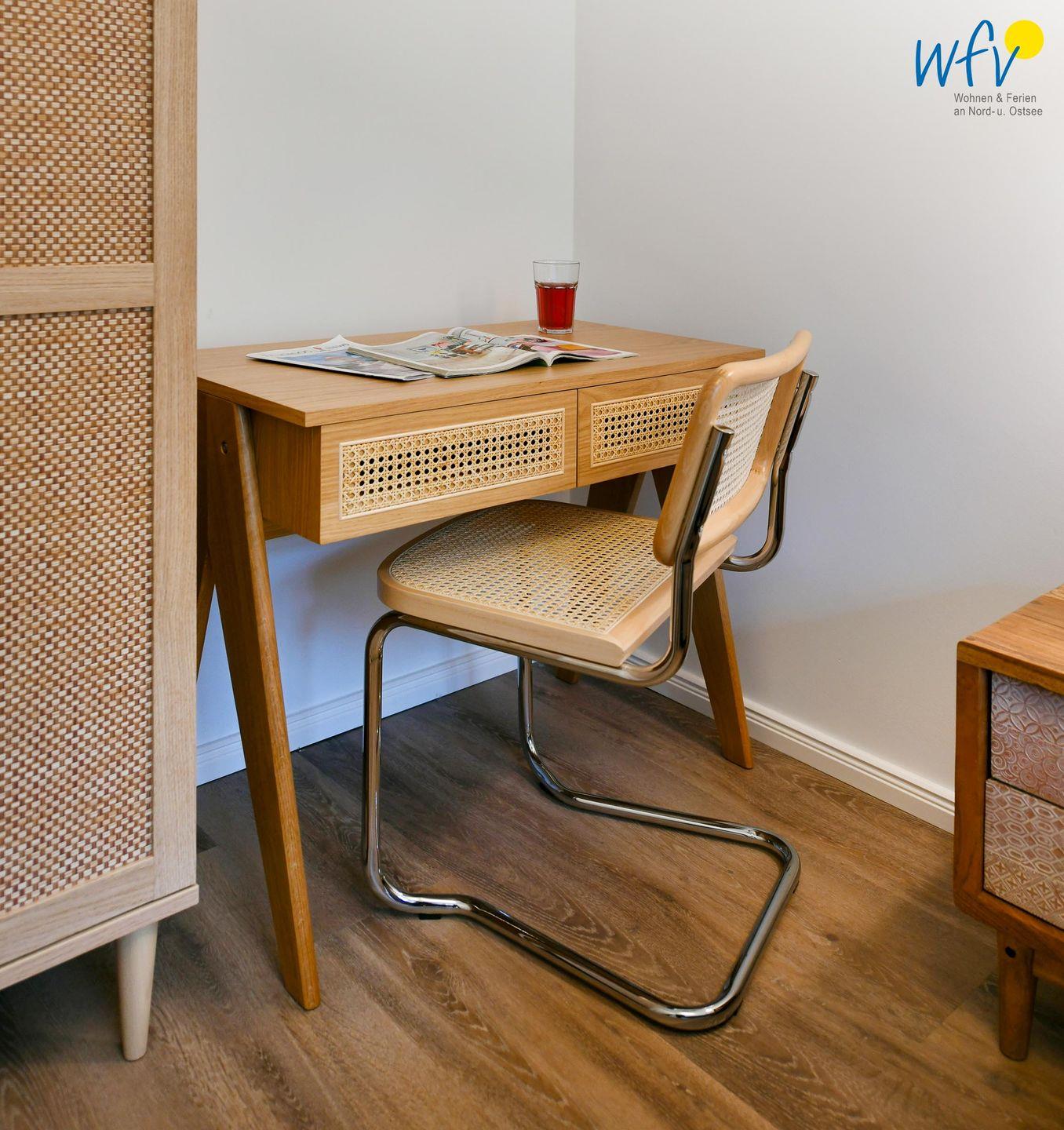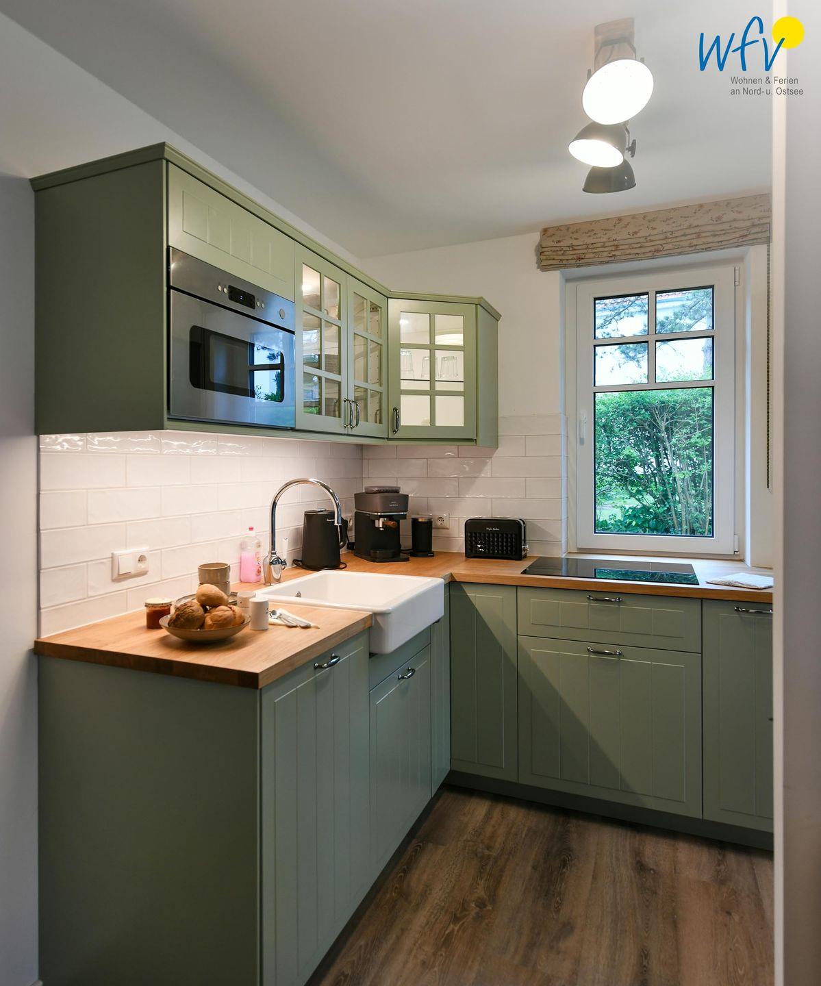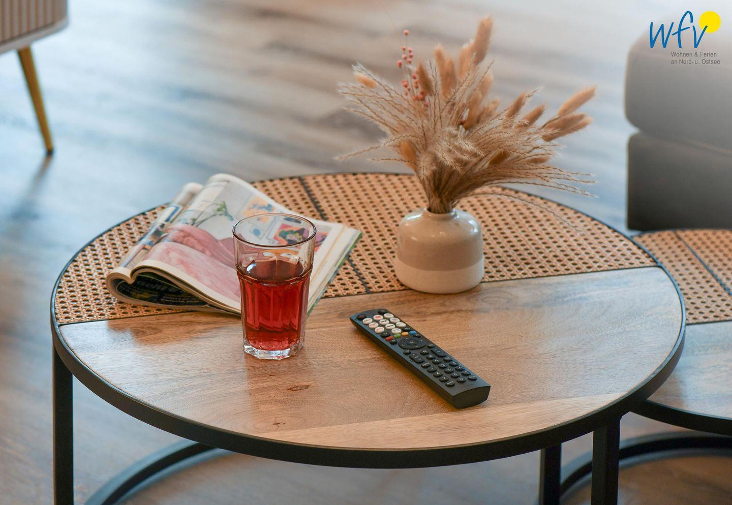 Die Ferienwohnung verfügt über ein modernes, offenes Wohnkonzept, das für ein weites Raumgefühl sorgt. Wohnbereich und Küche sind harmonisch miteinander verbunden, sodass Sie hier nach dem Strandtag oder der Fahrradtour gemütliche Abende auf dem bequemen Sofa verbringen, fernsehen und lesen können oder das gemeinsame Kochen genießen. Für kulinarische Erlebnisse ist die moderne Küche mit einem 4-Platten-Induktionsherd, einem Backofen, einer Mikrowelle, einem Kühlschrank sowie einer Spülmaschine ausgestattet. Als Kaffeeliebhaber können Sie zwischen einer klassischen Filterkaffeemaschine und einer Siebträger-Espressomaschine wählen. Der Essbereich mit breiter Fensterfront und schönem Lichteinfall lädt zu entspannten Mahlzeiten ein.