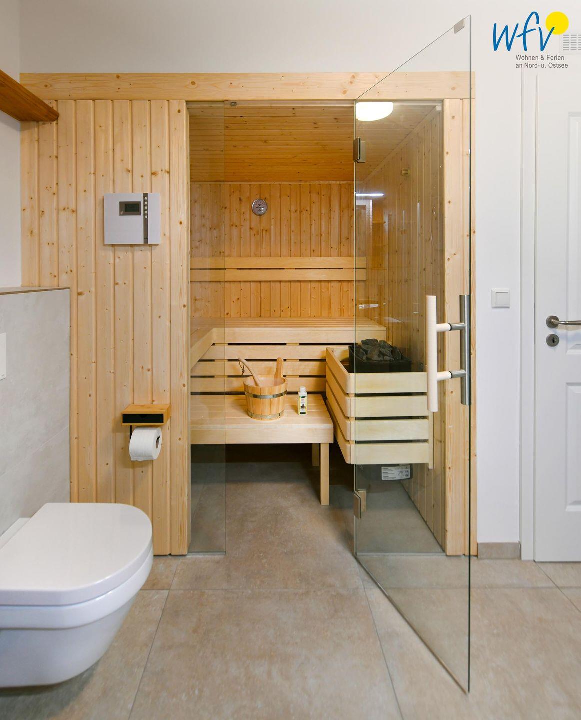 Das elegante Badezimmer mit eigener Sauna und offenem Duschbereich sorgt für wohltuende Entspannungszeit.