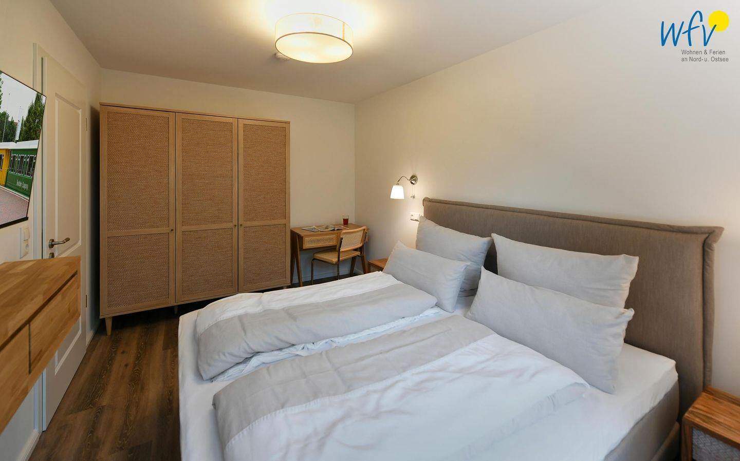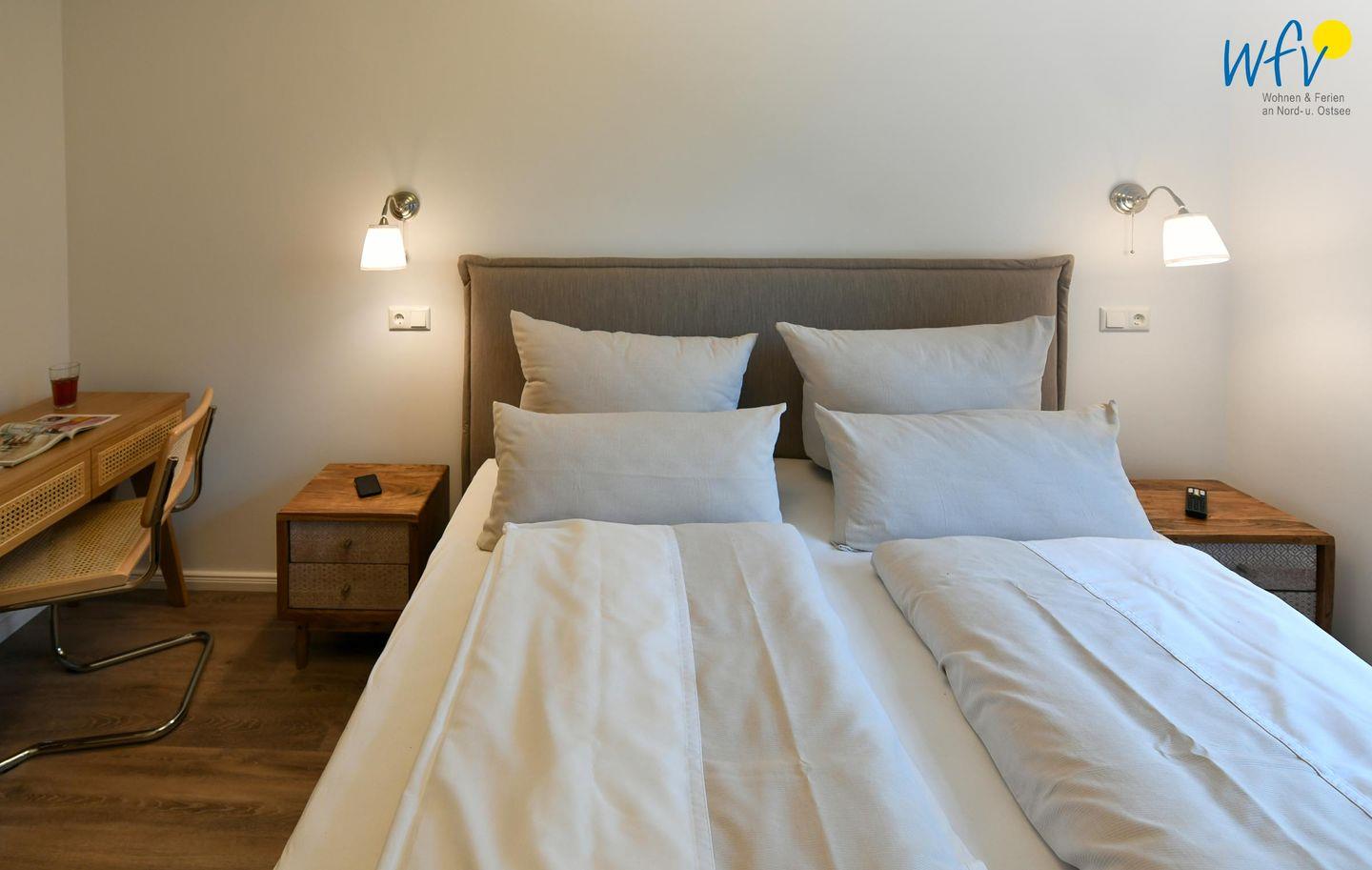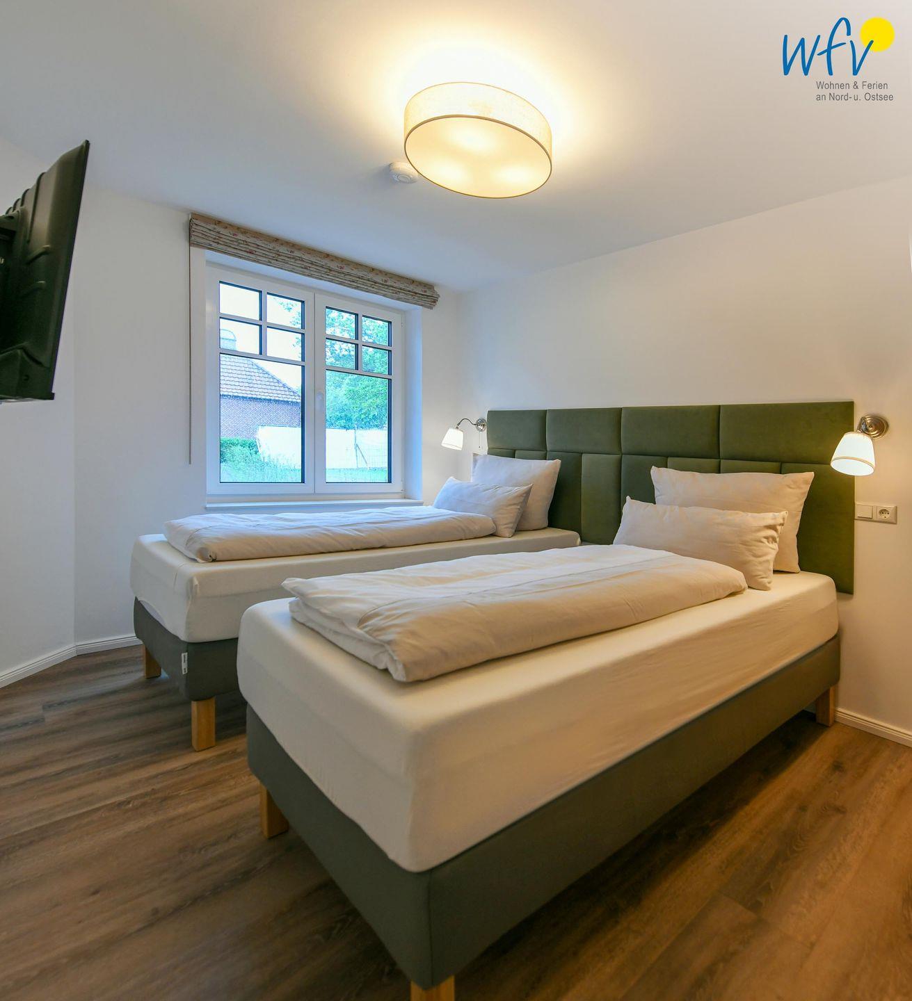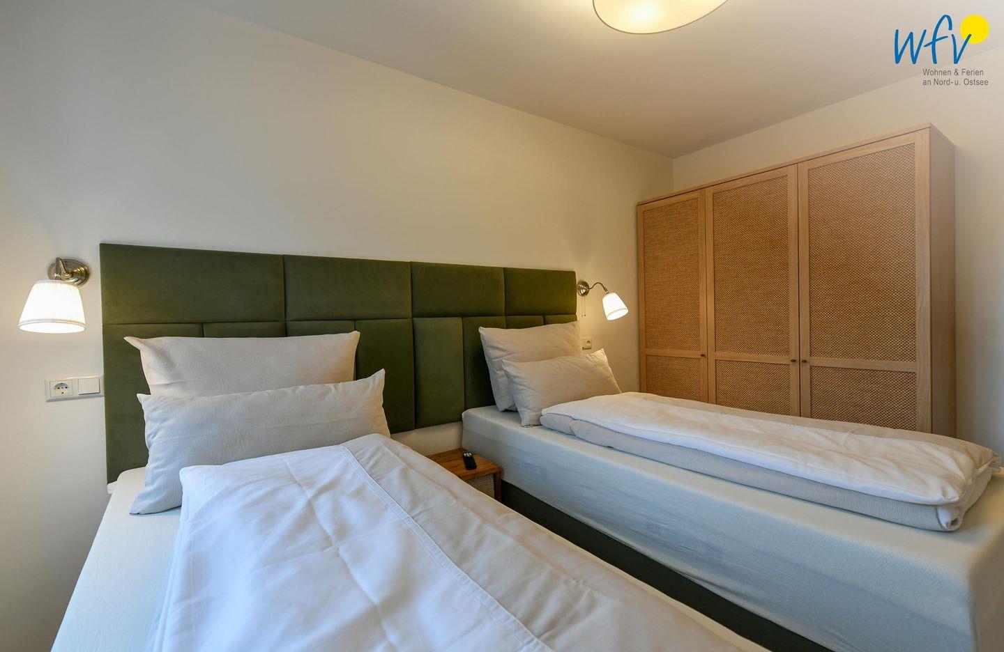 Die zwei separaten Schlafzimmer bieten Ihnen sowohl Komfort, als auch Privatsphäre. Ein Schlafzimmer ist mit einem komfortablen Kingsize-Boxspringbett ausgestattet, das zweite Schlafzimmer beinhaltet zwei Einzelbetten, die bei Bedarf auch zu einem Doppelbett zusammengeschoben werden können.