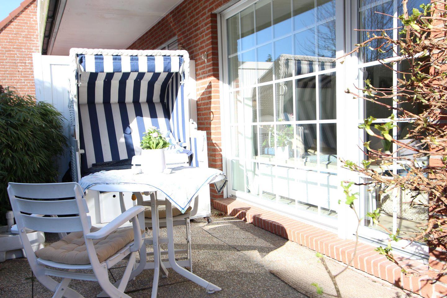 Die sonnige Terrasse mit Strandkorb lädt zum Verweilen ein.