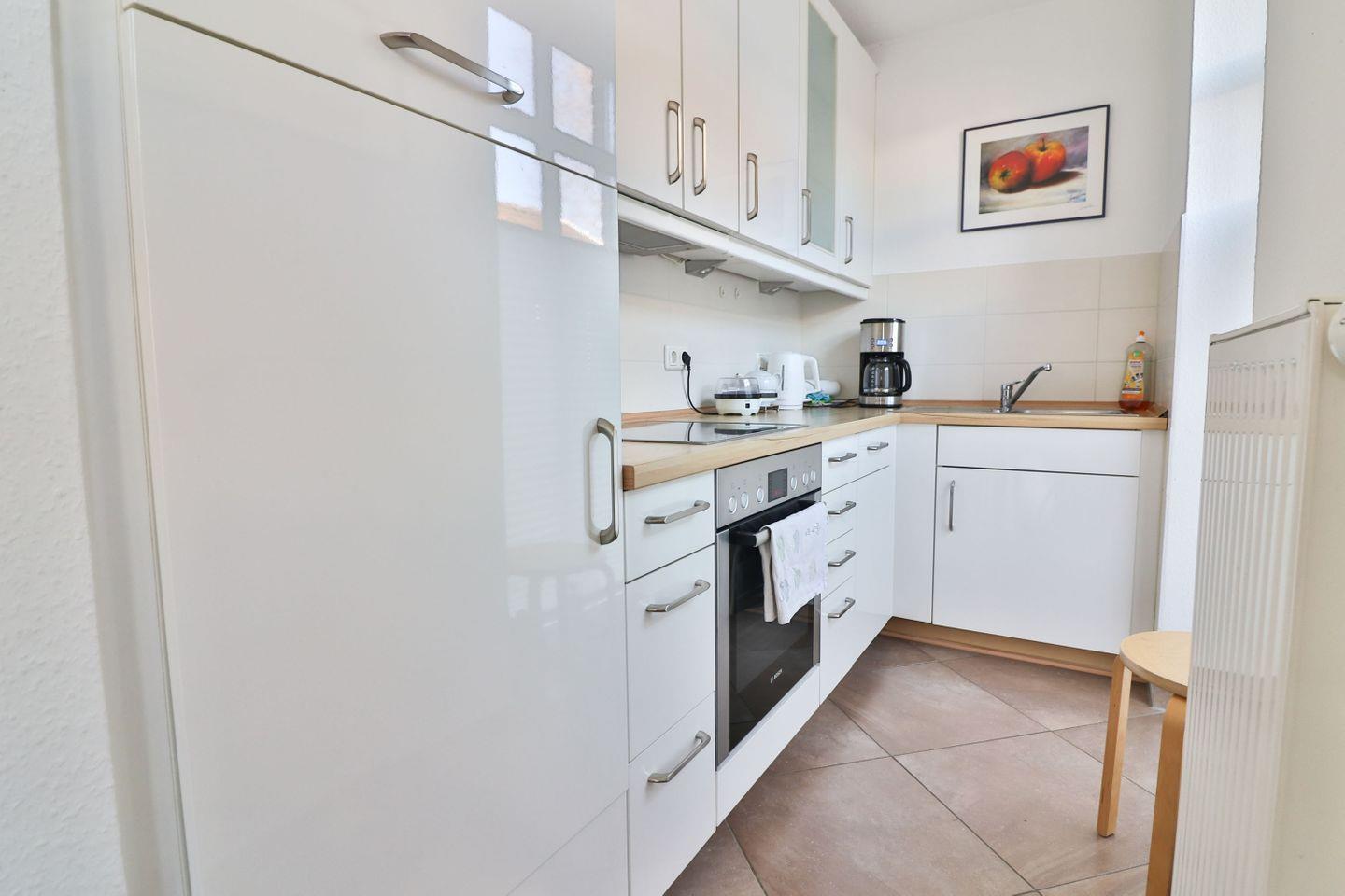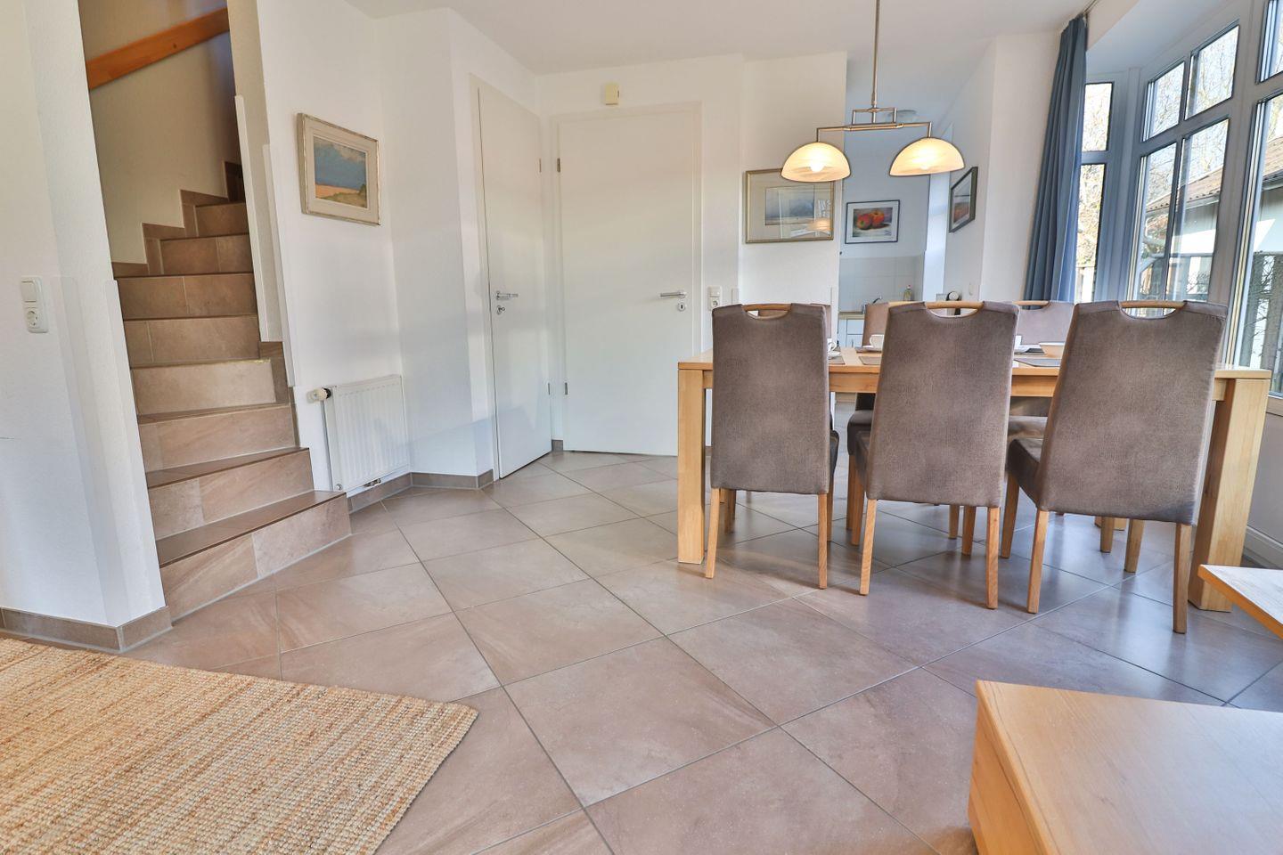 Im Erdgeschoss erwartet Sie der Wohnbereich, der offen zur voll ausgestatteten Küche gestaltet ist. Hier können Sie gemeinsam kochen und essen – der Esstisch bietet genügend Platz für alle Gäste. Die hochwertige Küche ist ausgestattet mit einem 4-Platten-Herd, einem Backofen, einer Spülmaschine, einem Kühlschrank mit Gefrierfach, einer Mikrowelle sowie weiteren nützlichen Küchengeräten wie einem Toaster, Mixer, Wasserkocher und einer Kaffeemaschine. Das stilvolle Ambiente und die offene Gestaltung schaffen eine einladende Atmosphäre, in der man sich wohlfühlen und entspannen kann.